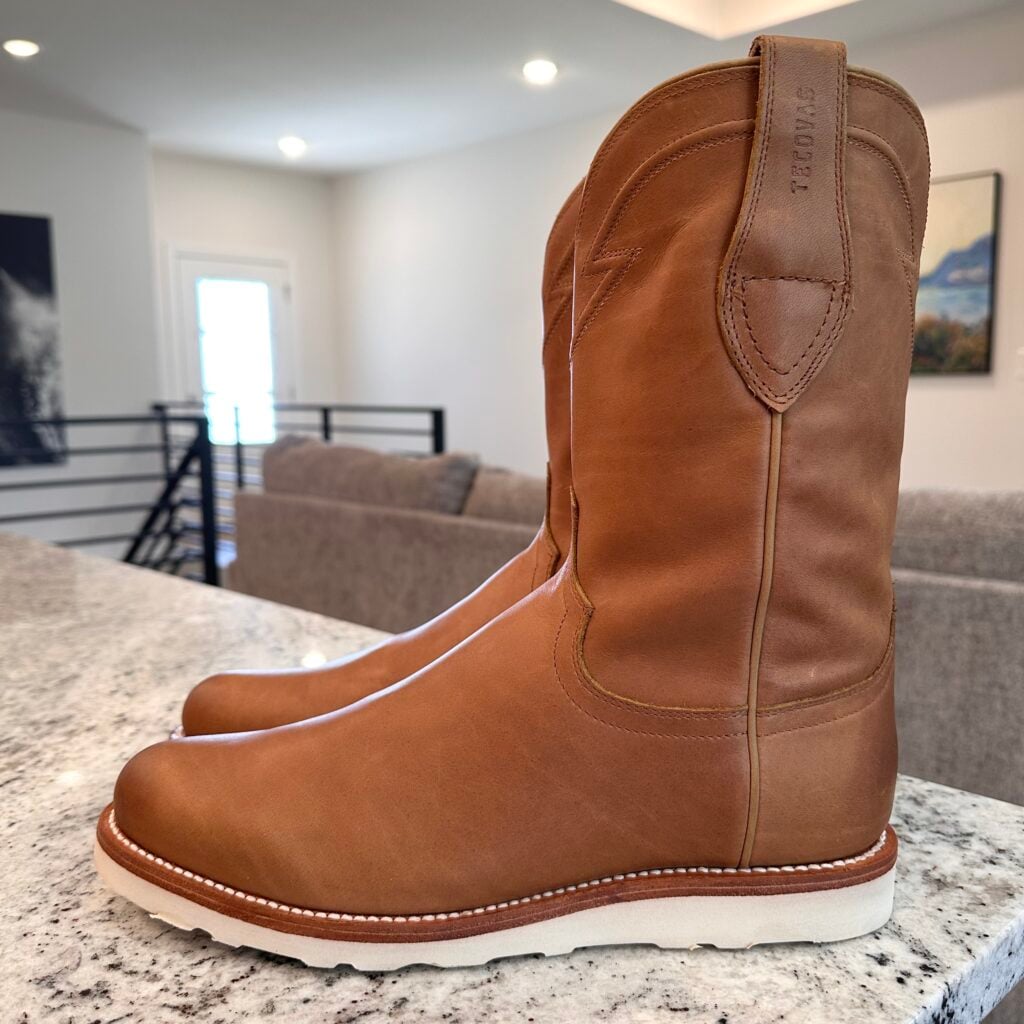 Type: These are men’s size 10.5 D Tecovas Knox boots in colorway “Wheat” (Tannish Brown). This is a discontinued colorway. Style 1025. Bovine leather. These boots have Vibram wedge outsoles. Soft toe. These boots are in excellent pre-owned condition, with very little signs of wear. Outsoles in great shape.