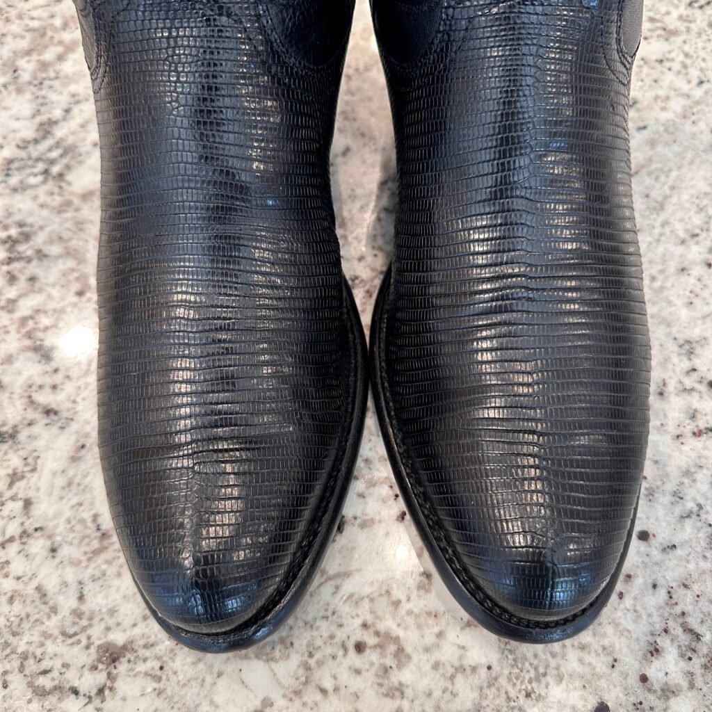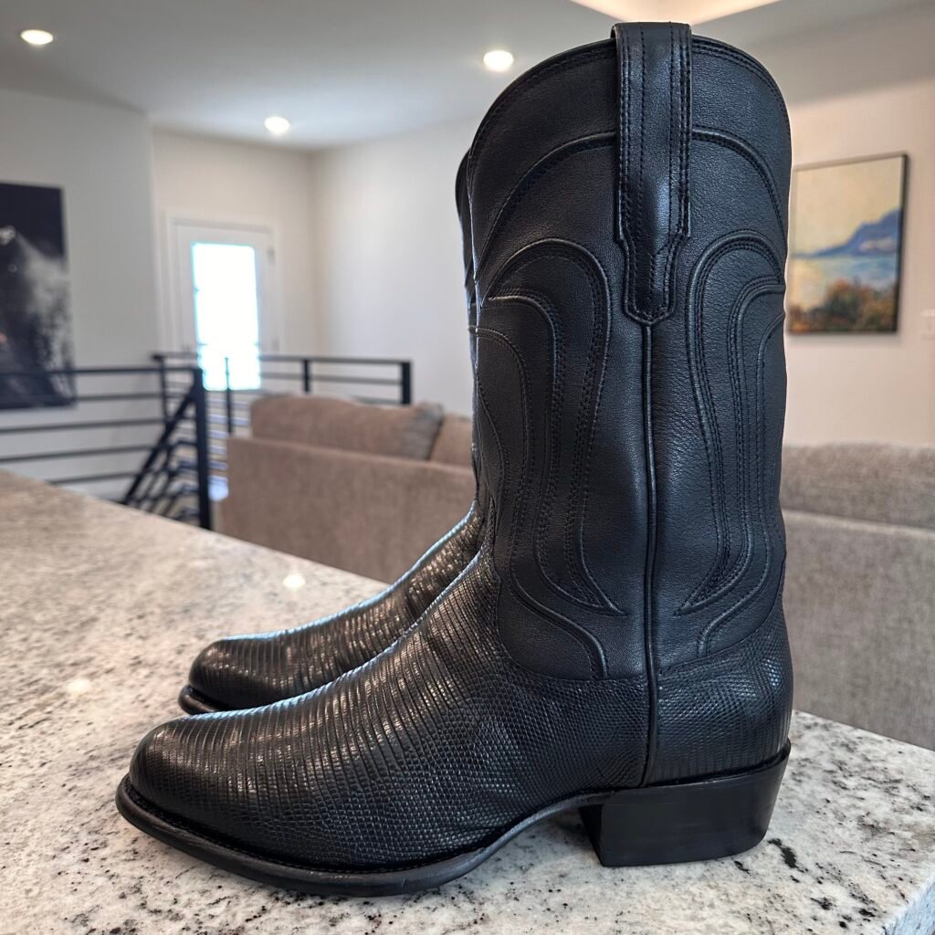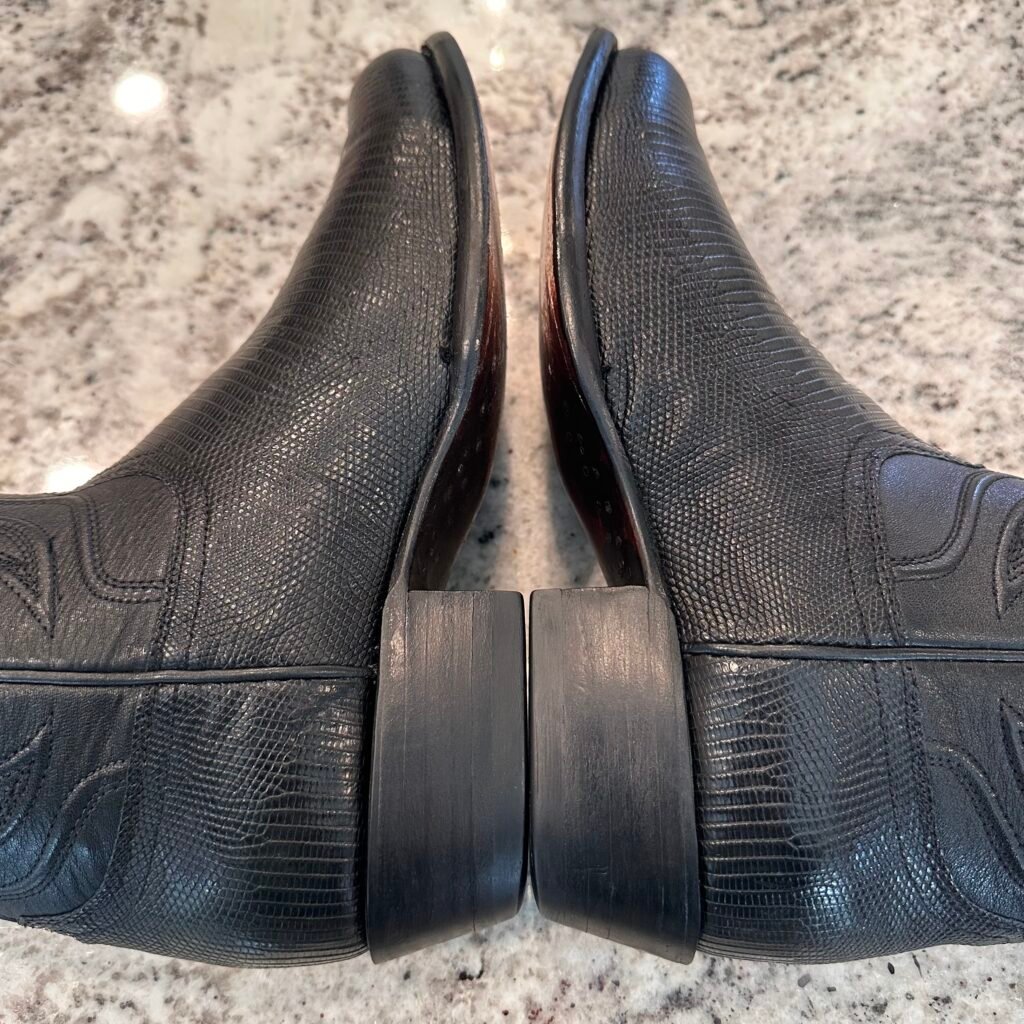 Type: These are men’s size 10 width EE Tecovas ‘The Nolan’ Lizard Boots in color midnight black. Tecovas style 1006. The lizard leather is in good condition. The outsoles and rubber heel caps show signs of wear from use, but still have life left in them.