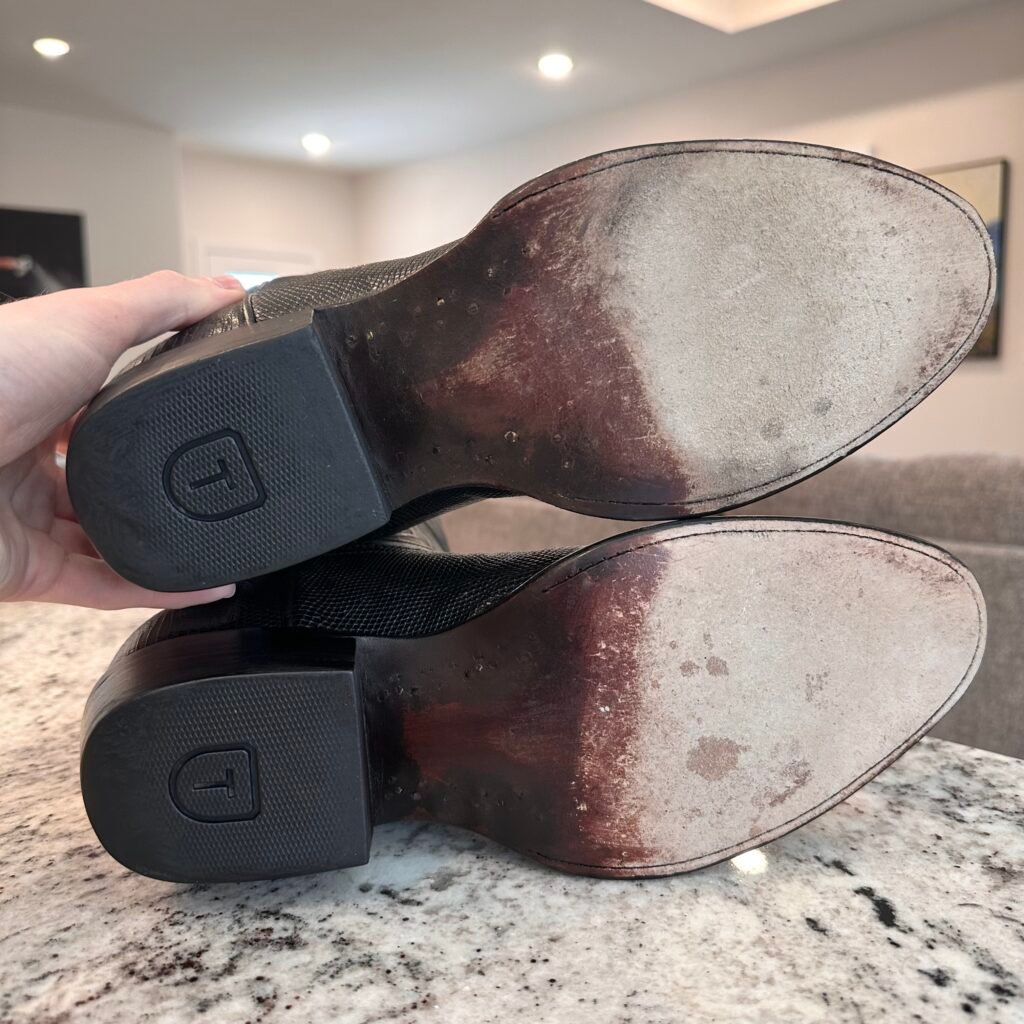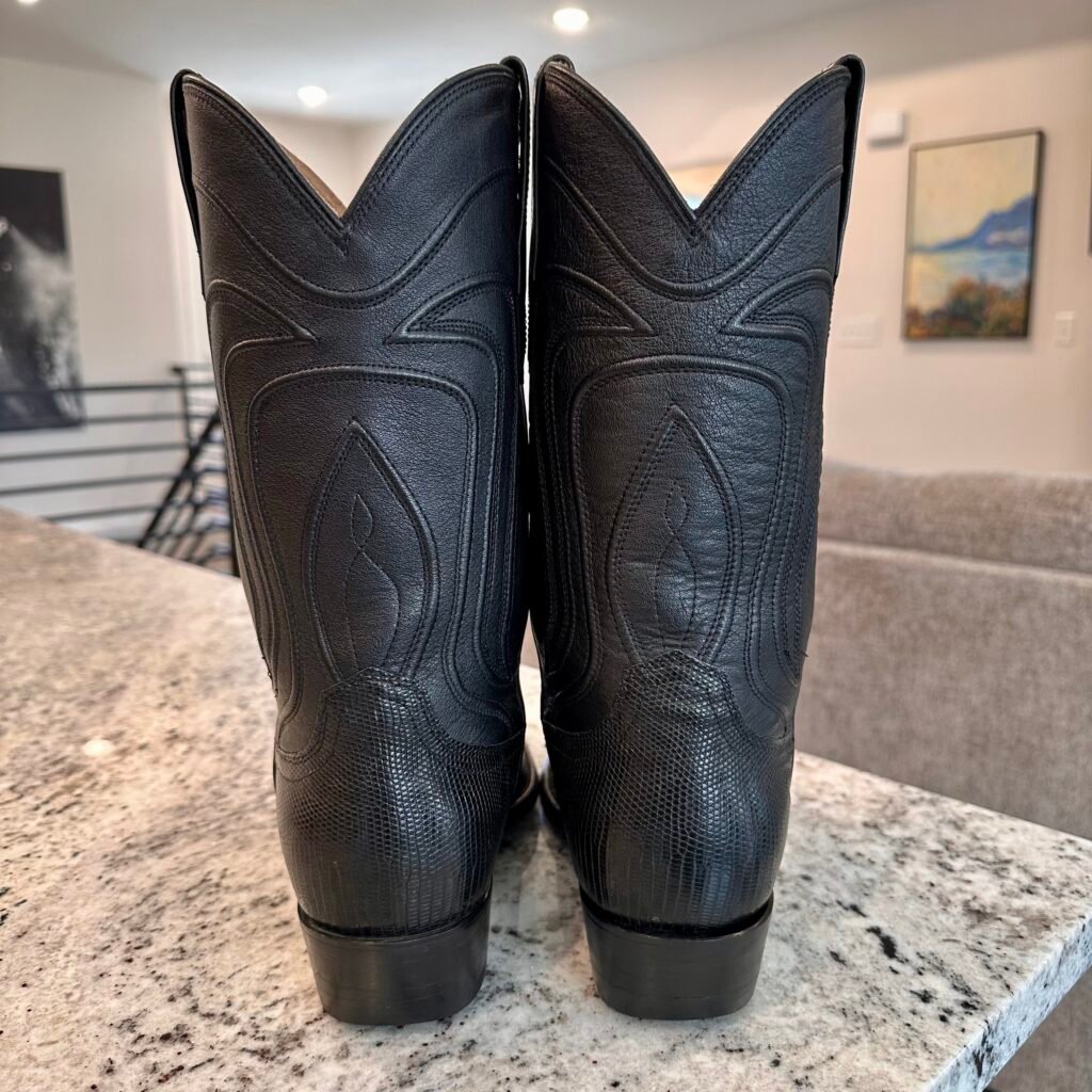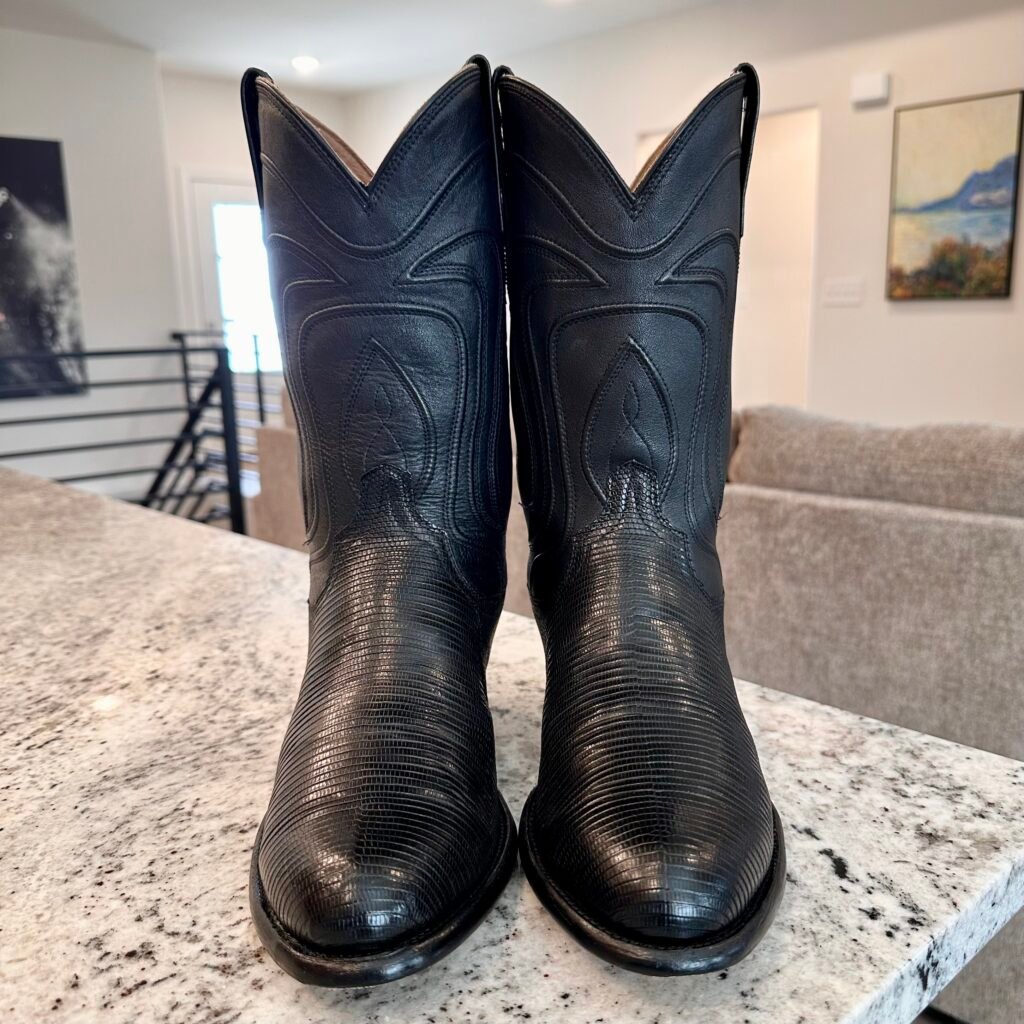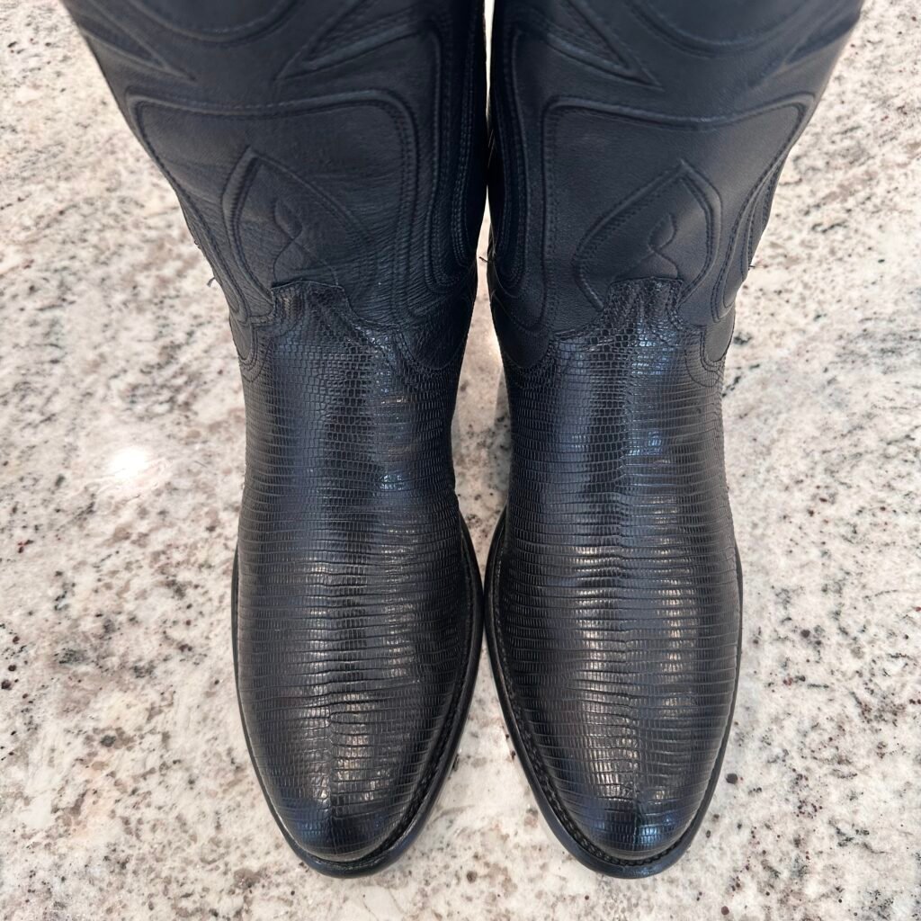 Type: These are men’s size 10 width EE Tecovas ‘The Nolan’ Lizard Boots in color midnight black. Tecovas style 1006. The lizard leather is in good condition. The outsoles and rubber heel caps show signs of wear from use, but still have life left in them.