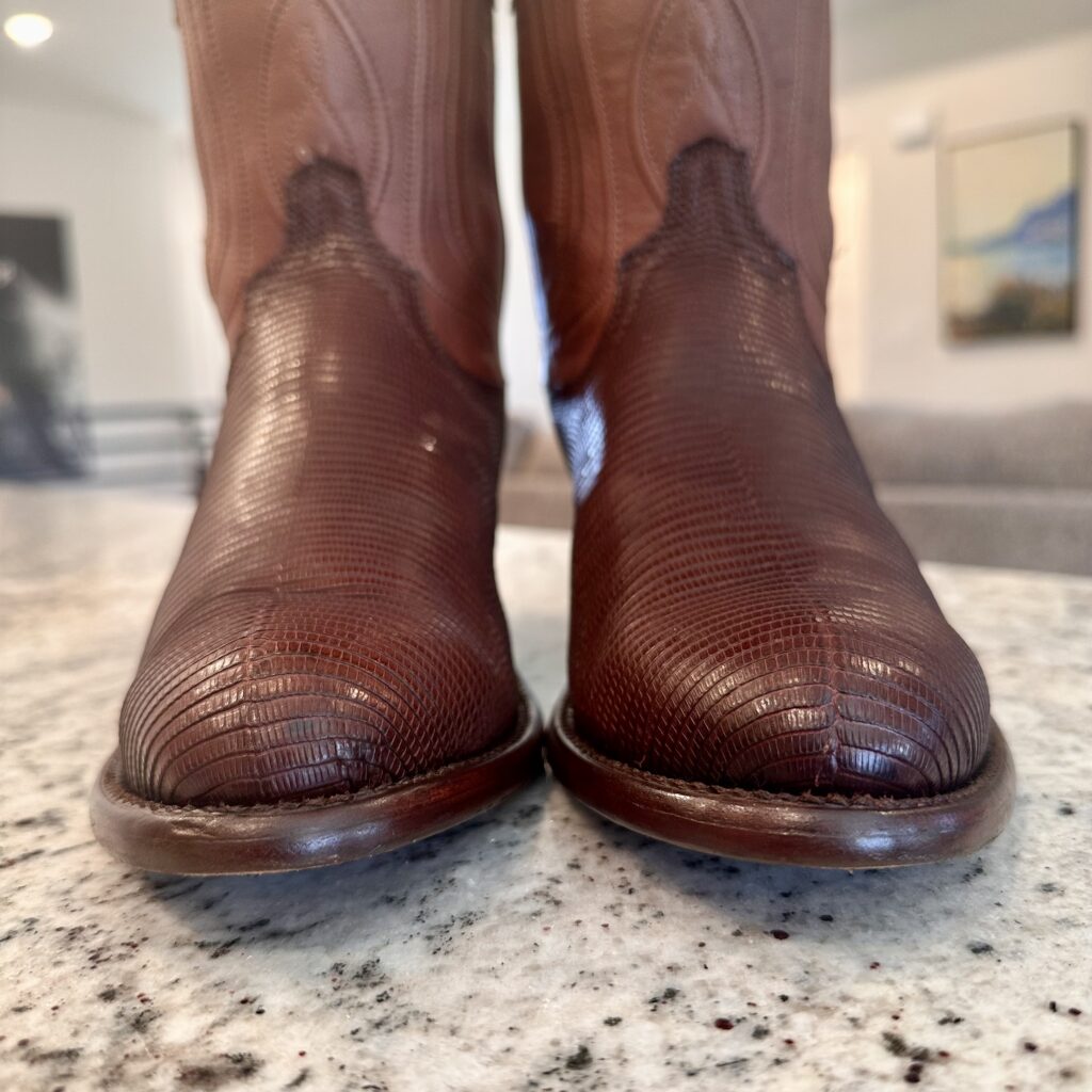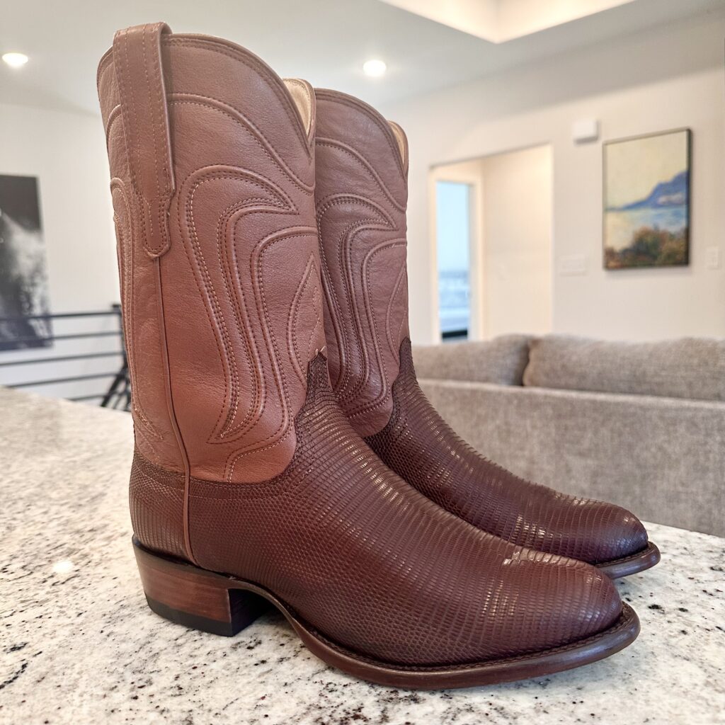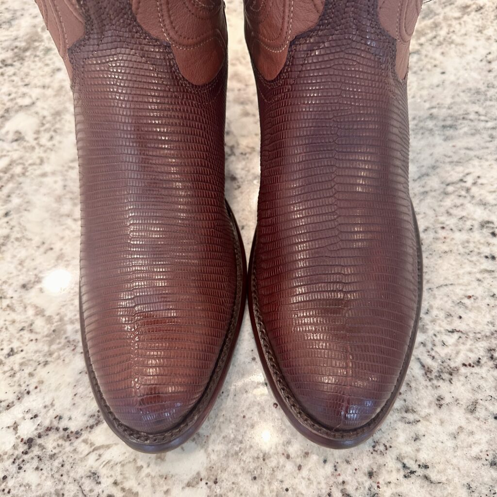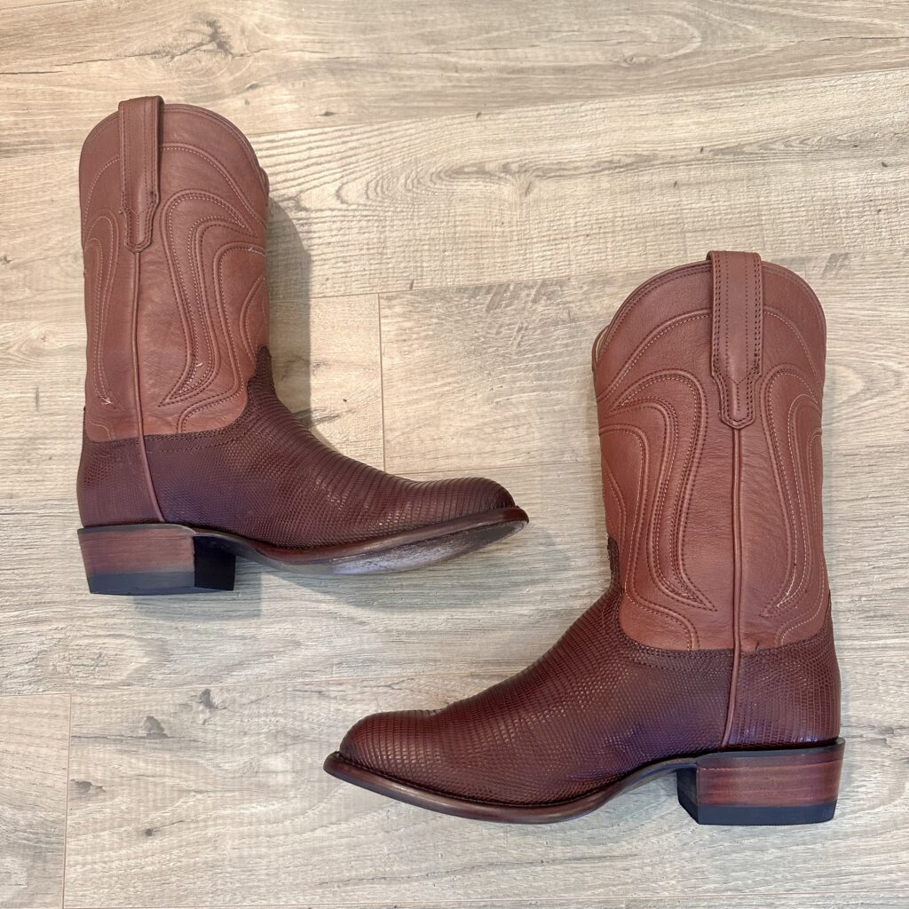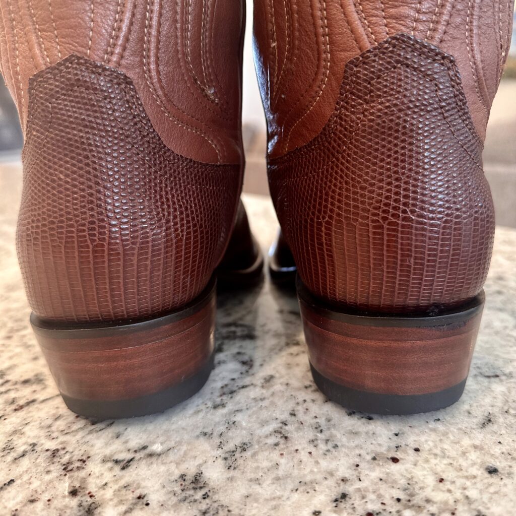 Boots: These are men’s size 8.5 D Tecovas ‘The Nolan’ Lizard Boots in color brown. These boots have a lizard leather vamp and counter with a calfskin leather shaft. Leather outsoles, round toe design. Tecovas style 1006.