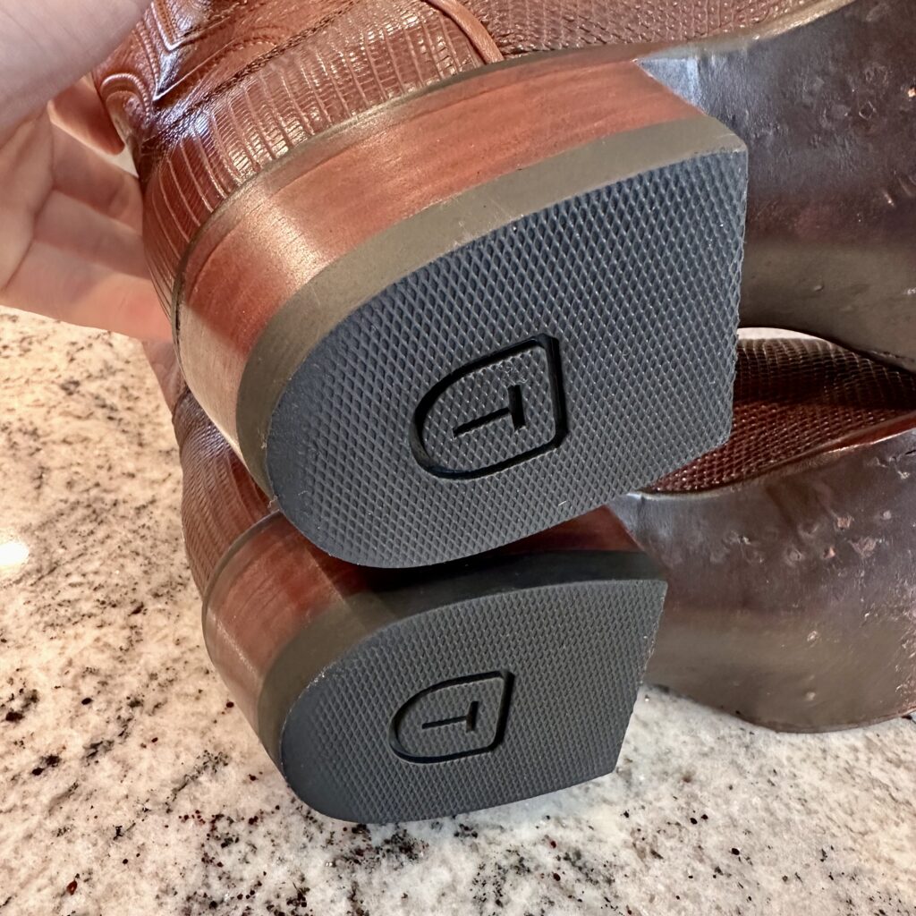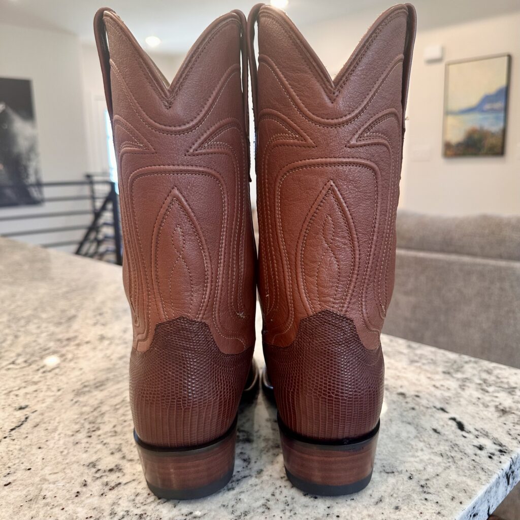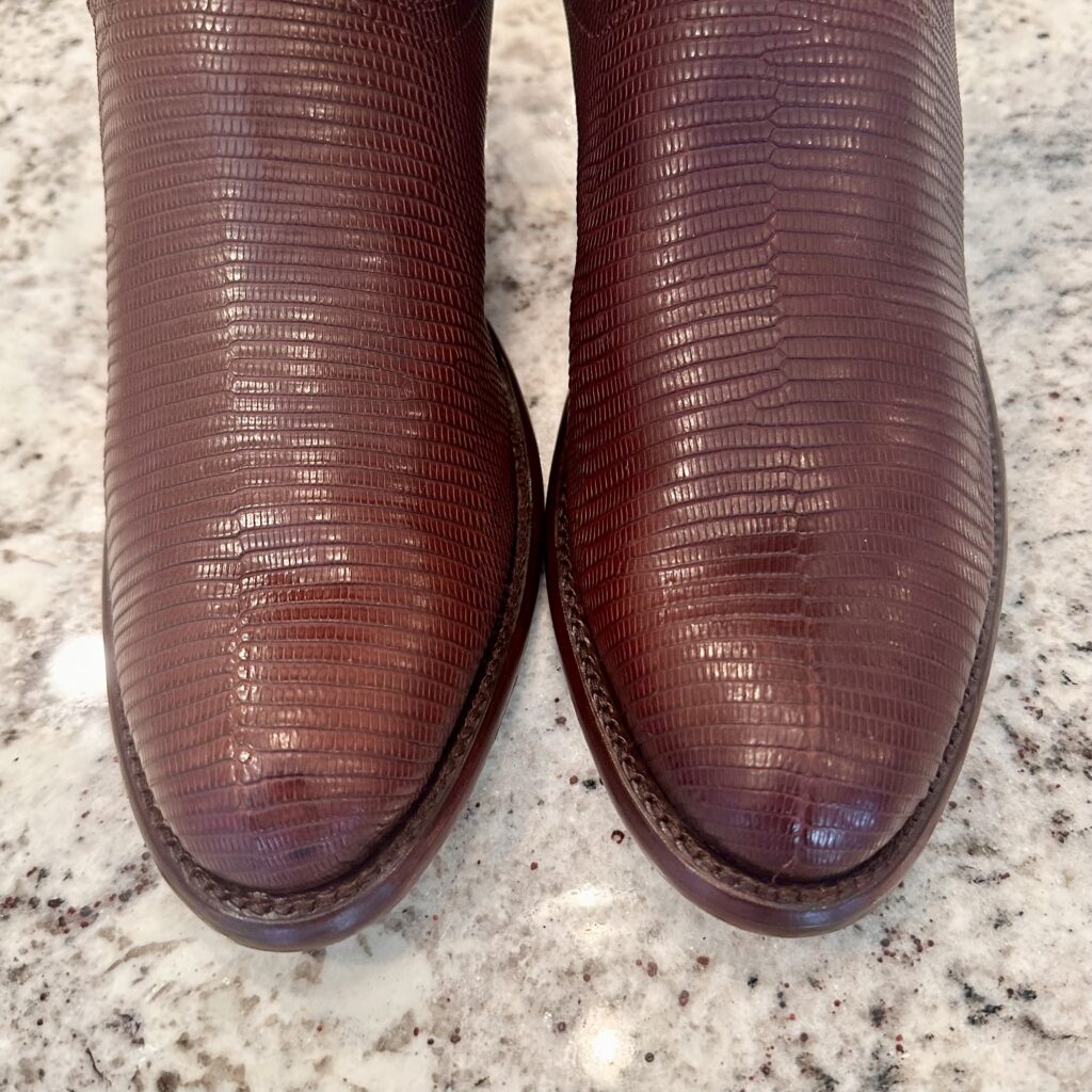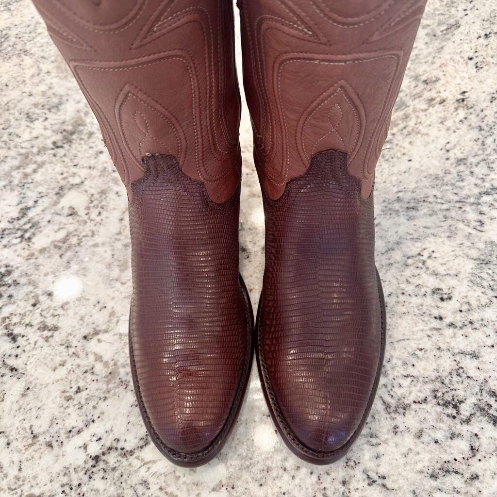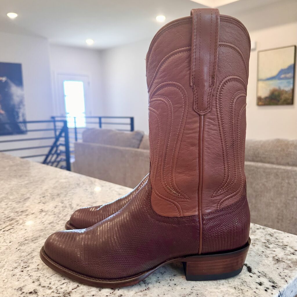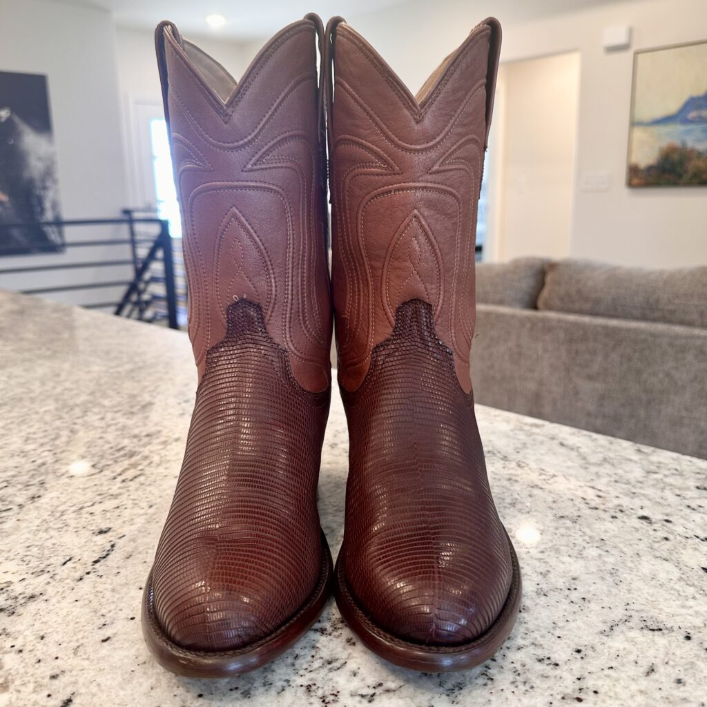 Boots: These are men’s size 8.5 D Tecovas ‘The Nolan’ Lizard Boots in color brown. These boots have a lizard leather vamp and counter with a calfskin leather shaft. Leather outsoles, round toe design. Tecovas style 1006.