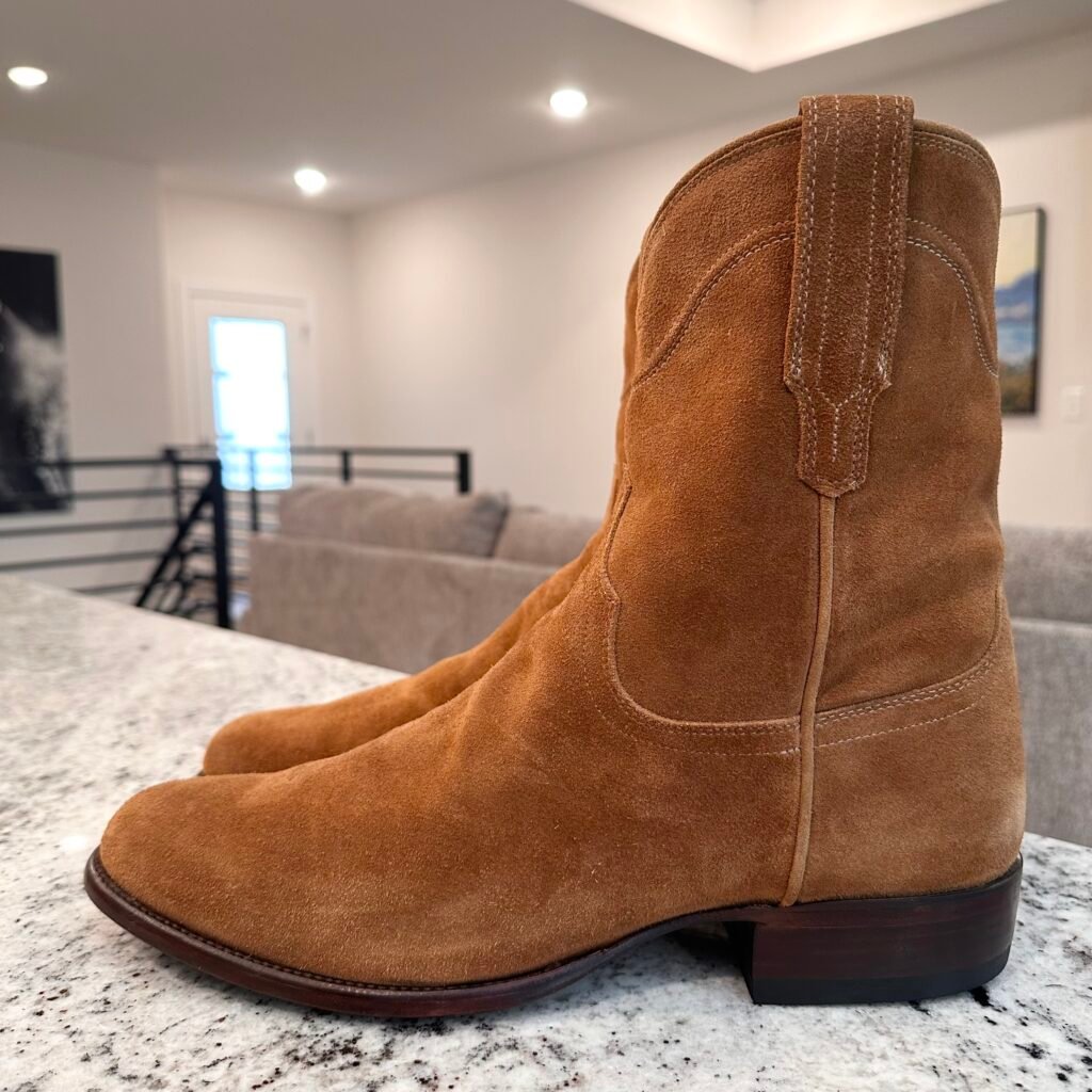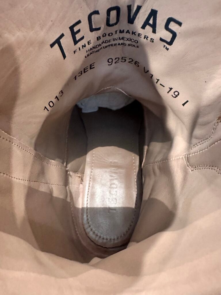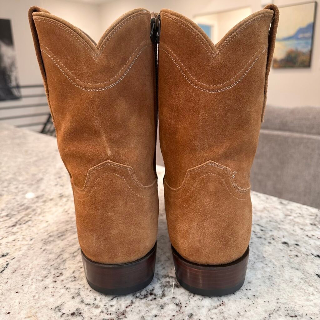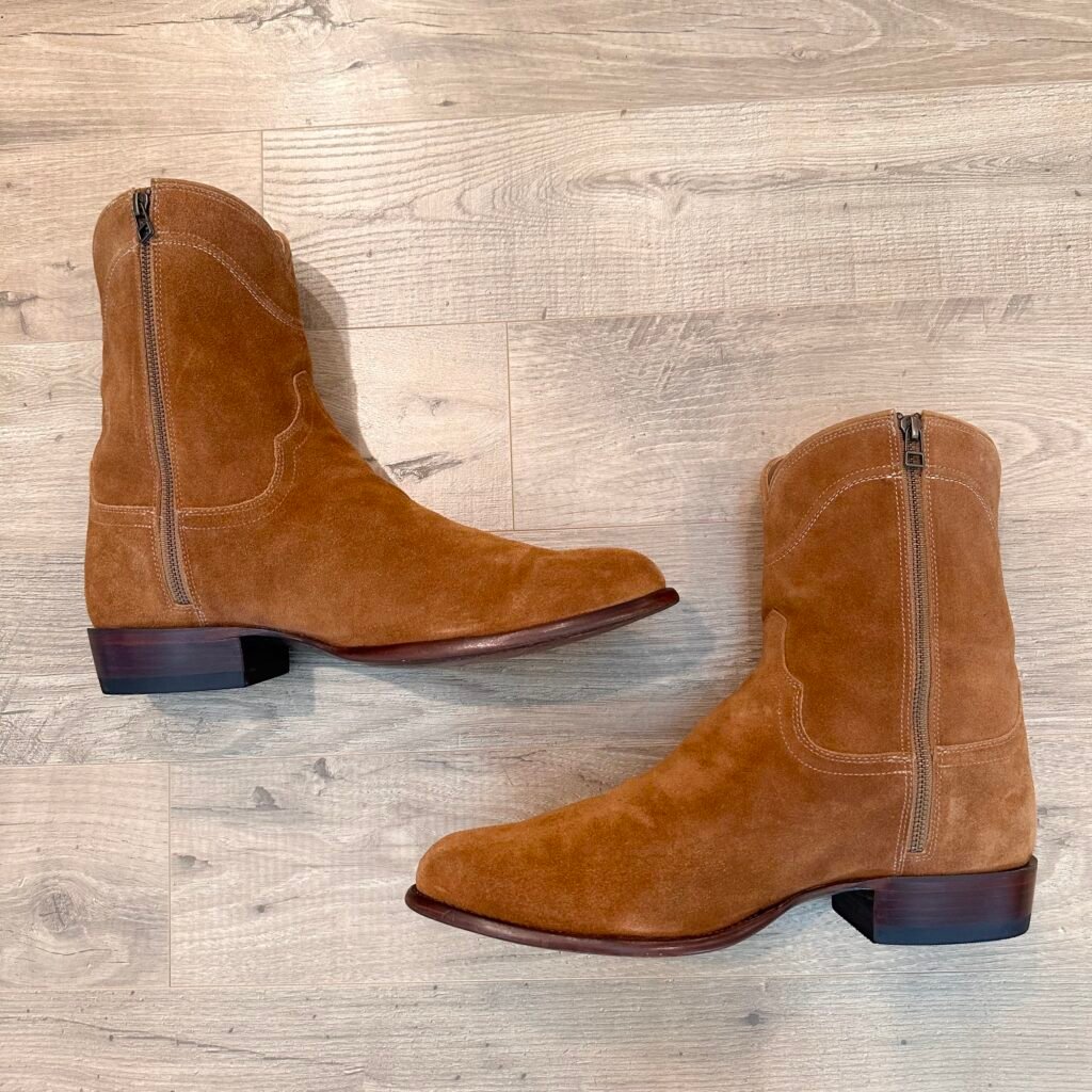 Type: These are men’s size 13 width EE Tecovas ‘The Roy’ Zip Suede Boots. This is the Honey Suede version. This Tecovas Roy Boot was their original zip-up suede boot that they produced from 2019 to 2025 time frame. They have since discontinued the Roy and just combined it with the Dean Zip (which now comes in suede versions). These boots have a waterproof suede upper with an inner side-zip entry. There is an inner leather zipper guard for comfort. Round toe with leather outsoles and rubber heel caps. Tecovas style 1013.