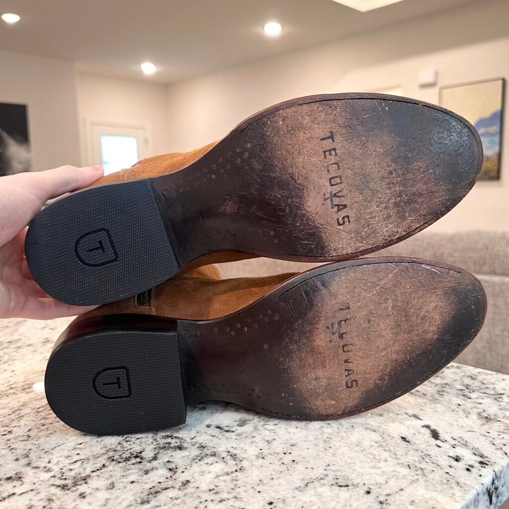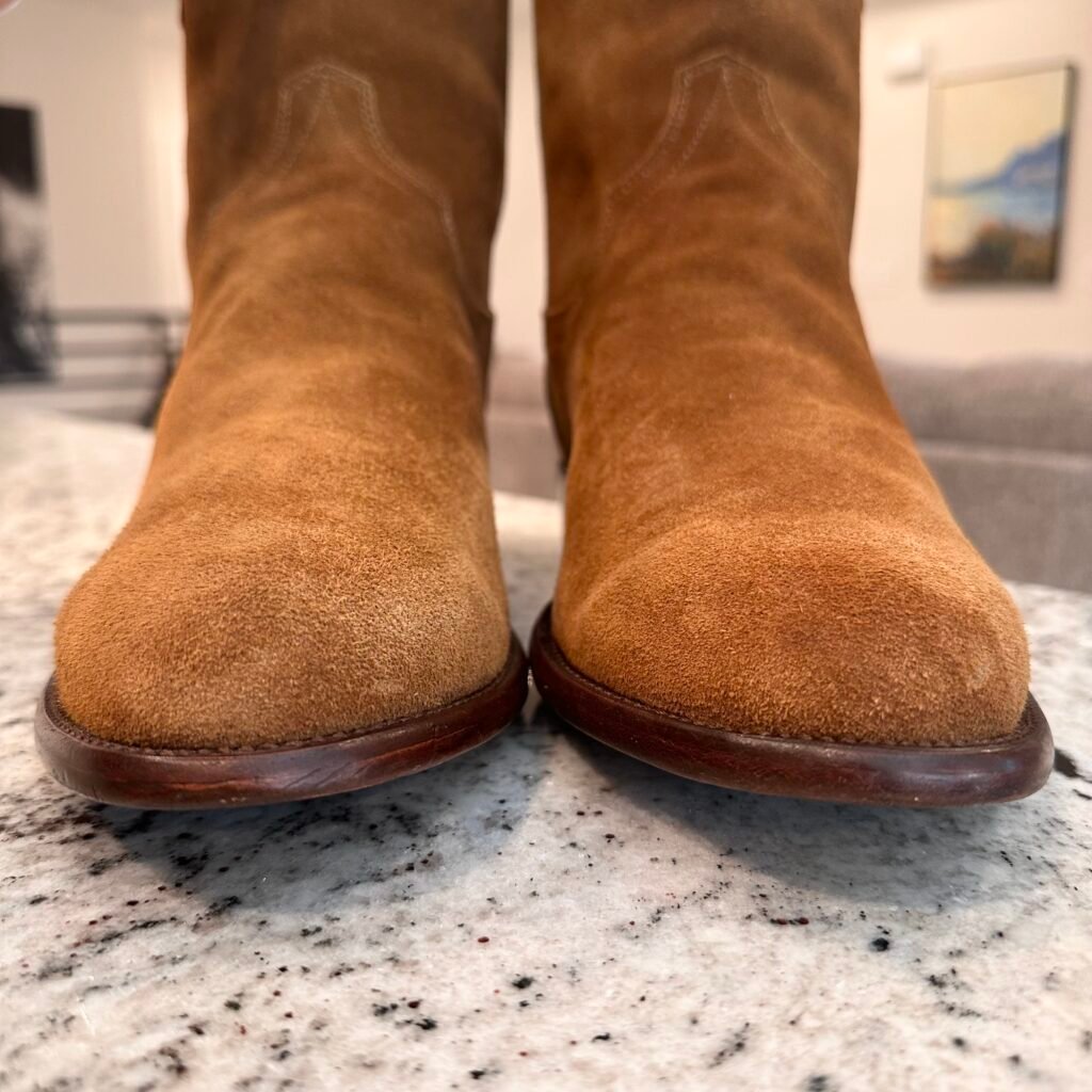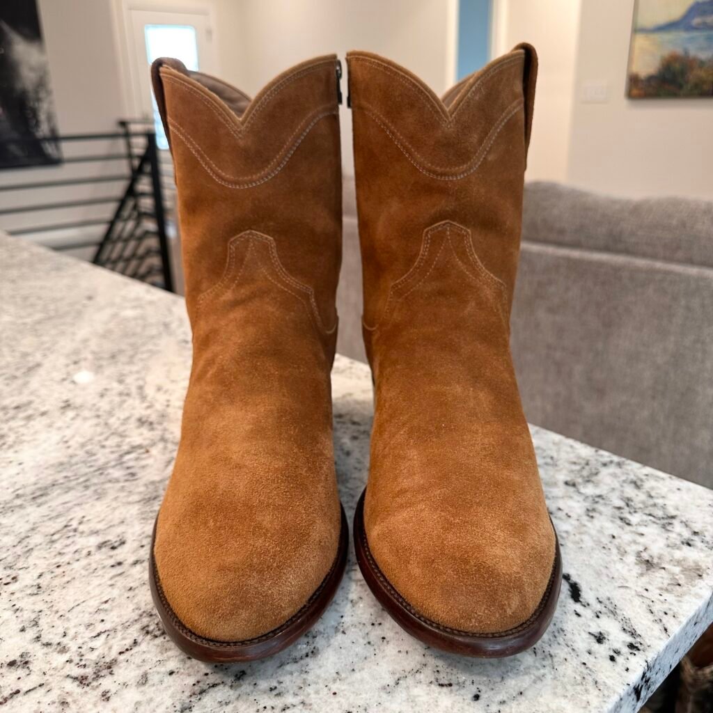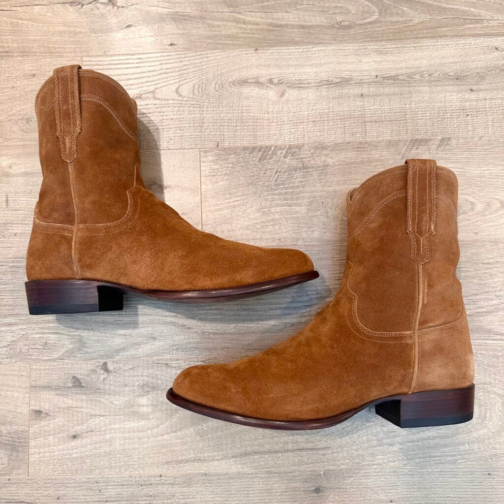 Type: These are men’s size 13 width EE Tecovas ‘The Roy’ Zip Suede Boots. This is the Honey Suede version. This Tecovas Roy Boot was their original zip-up suede boot that they produced from 2019 to 2025 time frame. They have since discontinued the Roy and just combined it with the Dean Zip (which now comes in suede versions). These boots have a waterproof suede upper with an inner side-zip entry. There is an inner leather zipper guard for comfort. Round toe with leather outsoles and rubber heel caps. Tecovas style 1013.