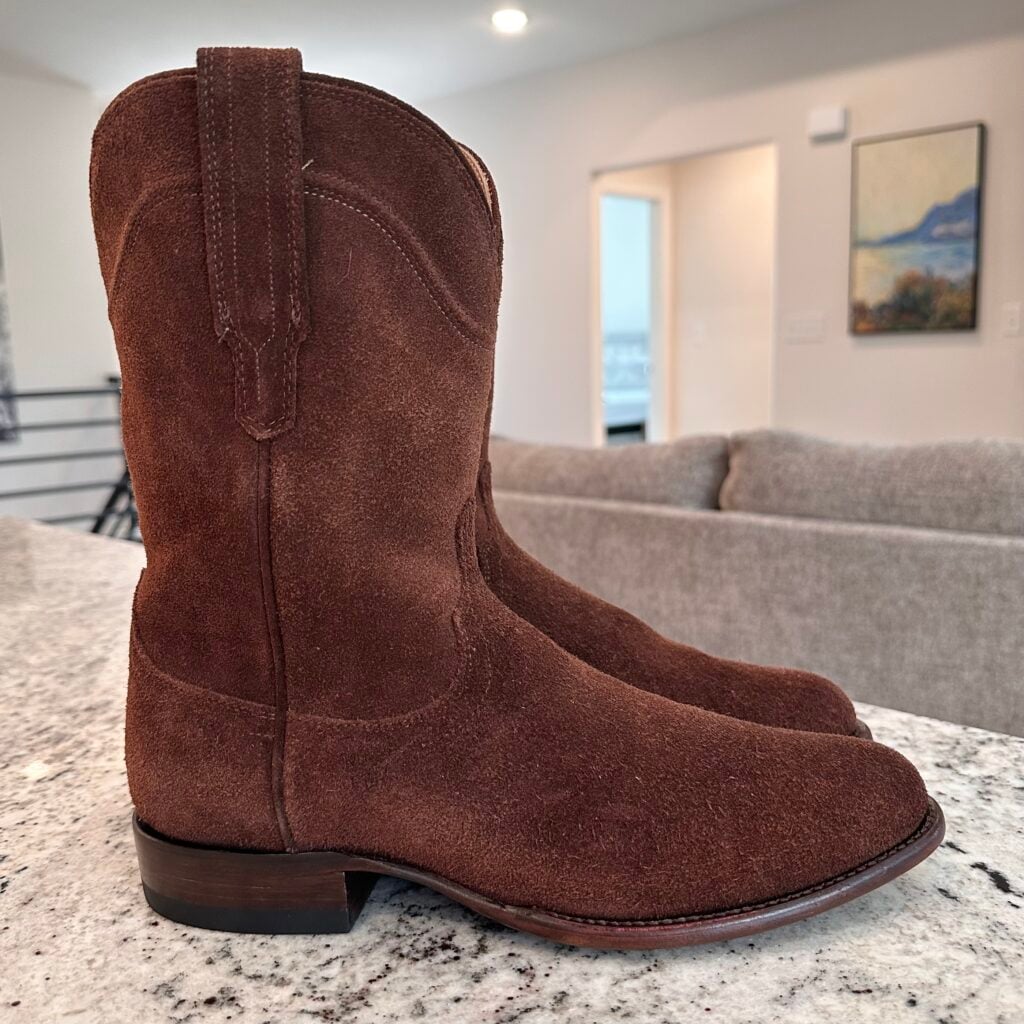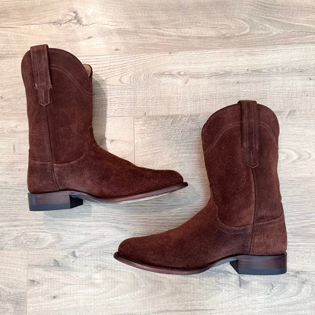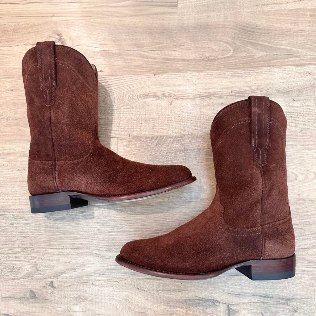 Type: These are men’s size 9.5 D Tecovas Shane Boots in colorway Mocha (Dark Brown). The Shane was Tecovas’ original suede roper boots – it was offered from 2018 through 2024 time frame. This Mocha colorway was part of the original release of the Shane in the 2018 time frame. Leather outsoles with a roper heel. Tecovas style 1009. The suede is in good shape with gentle signs of wear.