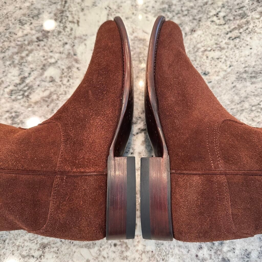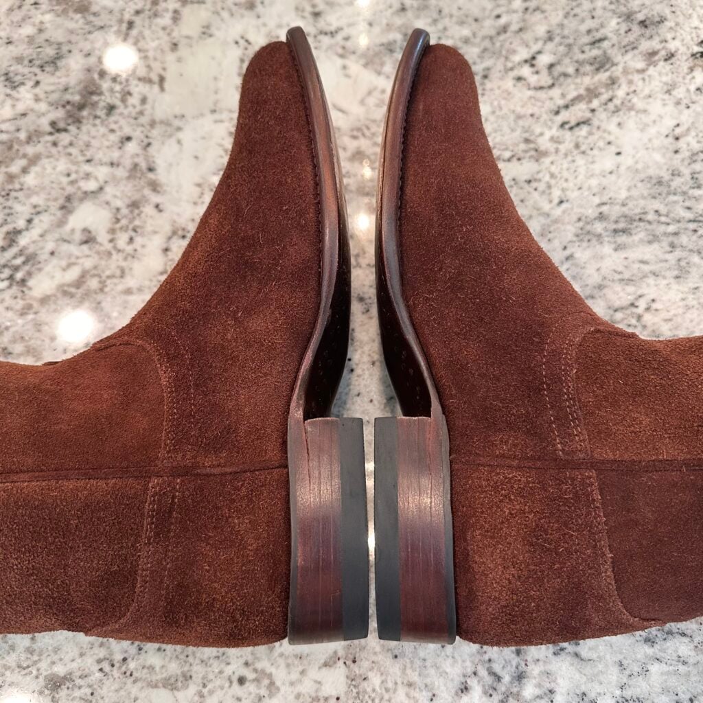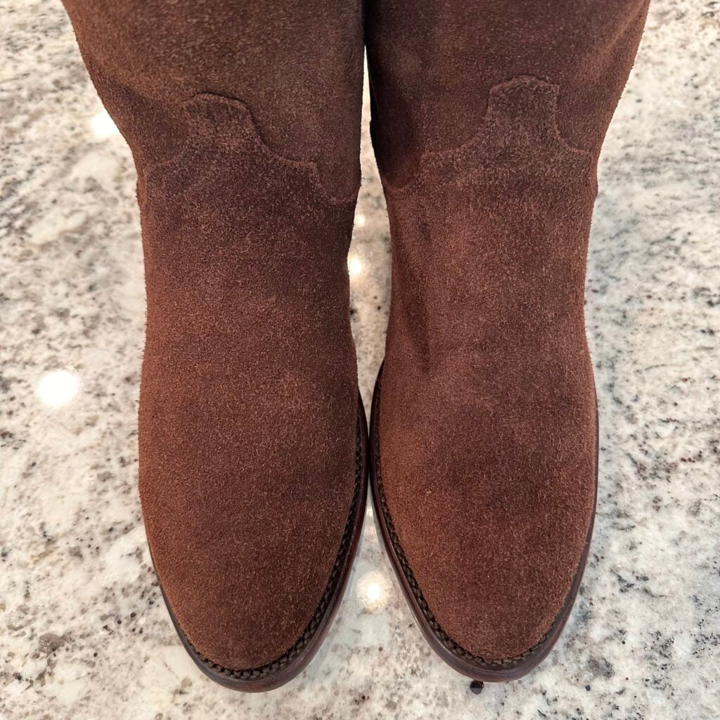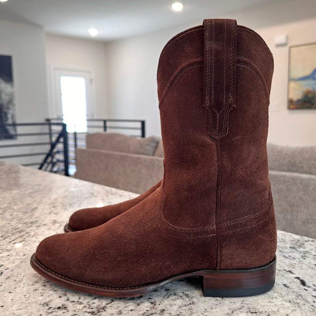 Type: These are men’s size 9.5 D Tecovas Shane Boots in colorway Mocha (Dark Brown). The Shane was Tecovas’ original suede roper boots – it was offered from 2018 through 2024 time frame. This Mocha colorway was part of the original release of the Shane in the 2018 time frame. Leather outsoles with a roper heel. Tecovas style 1009. The suede is in good shape with gentle signs of wear.