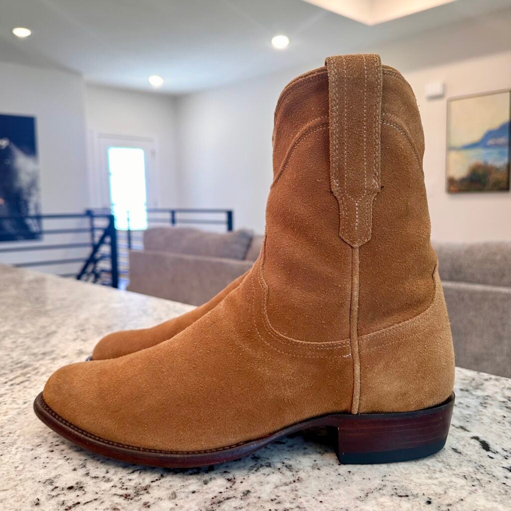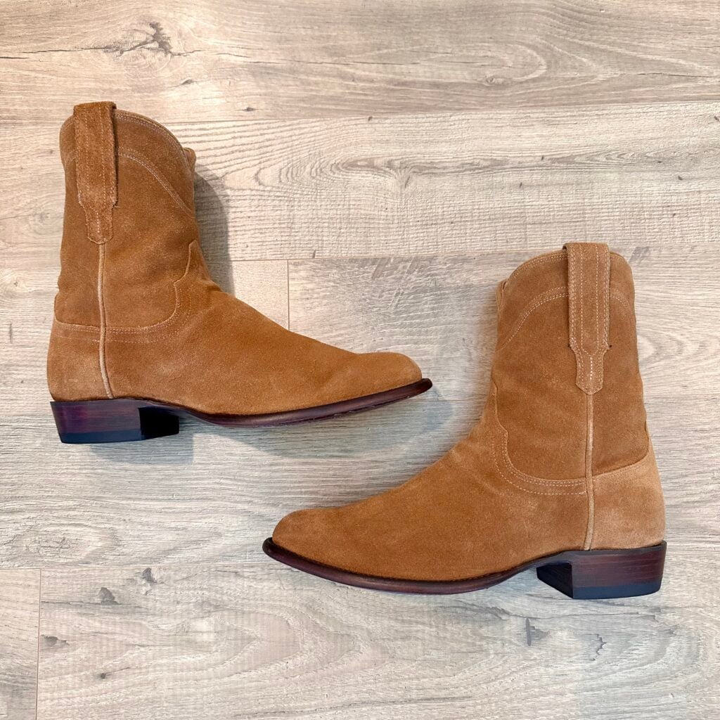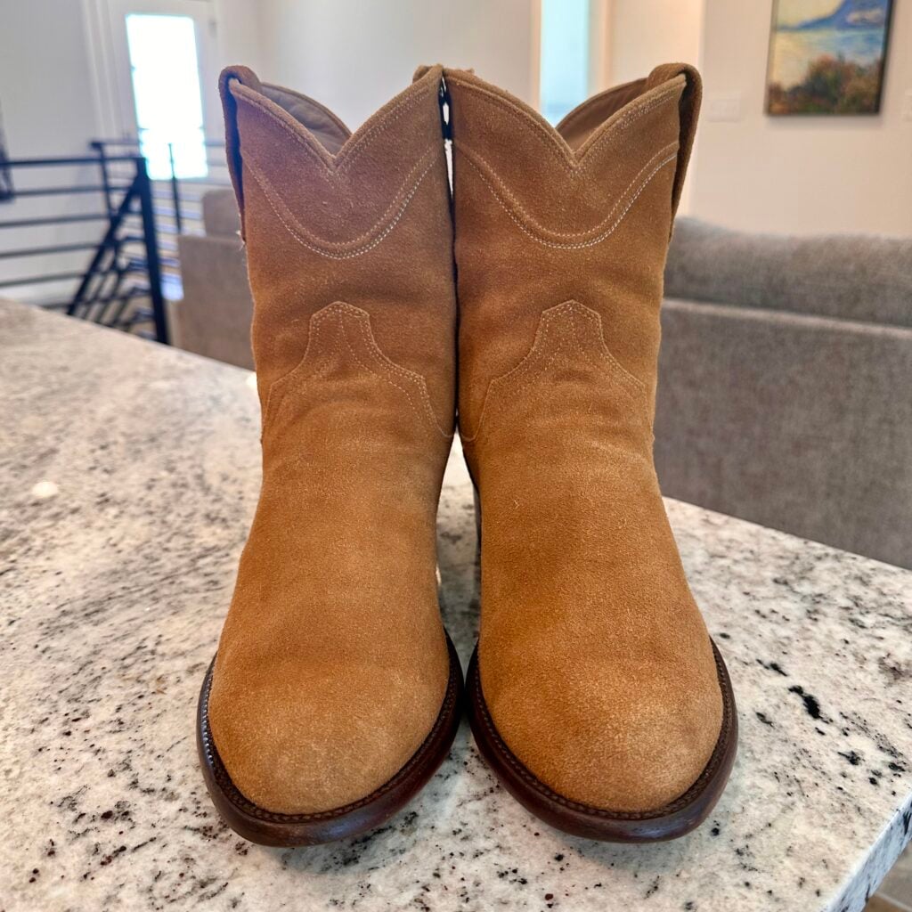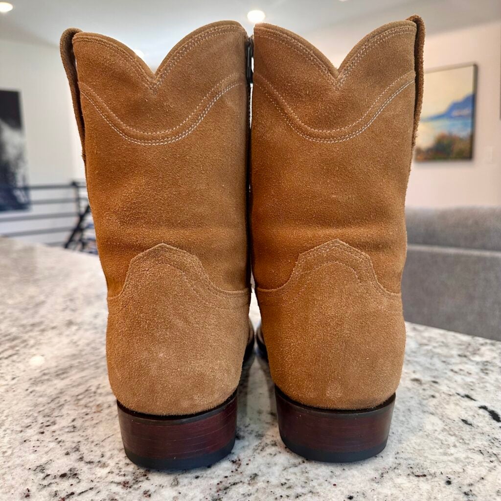 Type: These are men’s size 10.5 EE Tecovas ‘The Roy’ Zip Suede Boots. This is the Honey Suede version. The Tecovas Roy Boot was their original zip-up suede boot that they produced from 2019 to 2025 time frame. They have since discontinued the Roy and just combined it with the Dean Zip (which now comes in suede versions). These boots have a waterproof suede upper with a side-zip entry. There is an inner leather zipper guard for comfort. Round toe with leather outsoles and rubber heel caps. Tecovas style 1013. The suede is in good shape, but there is gentle scuffing near the toes and heels from use and some gentle creasing from use. Zippers in good working condition.