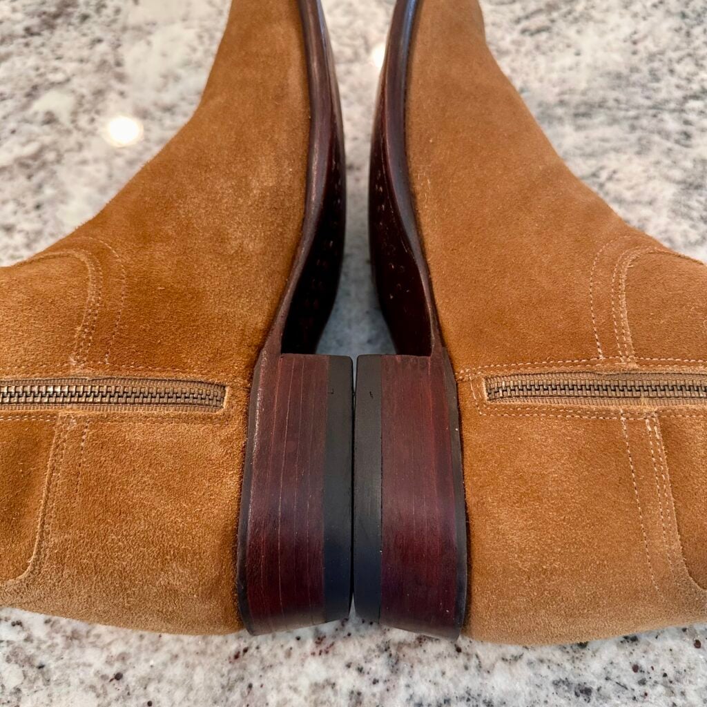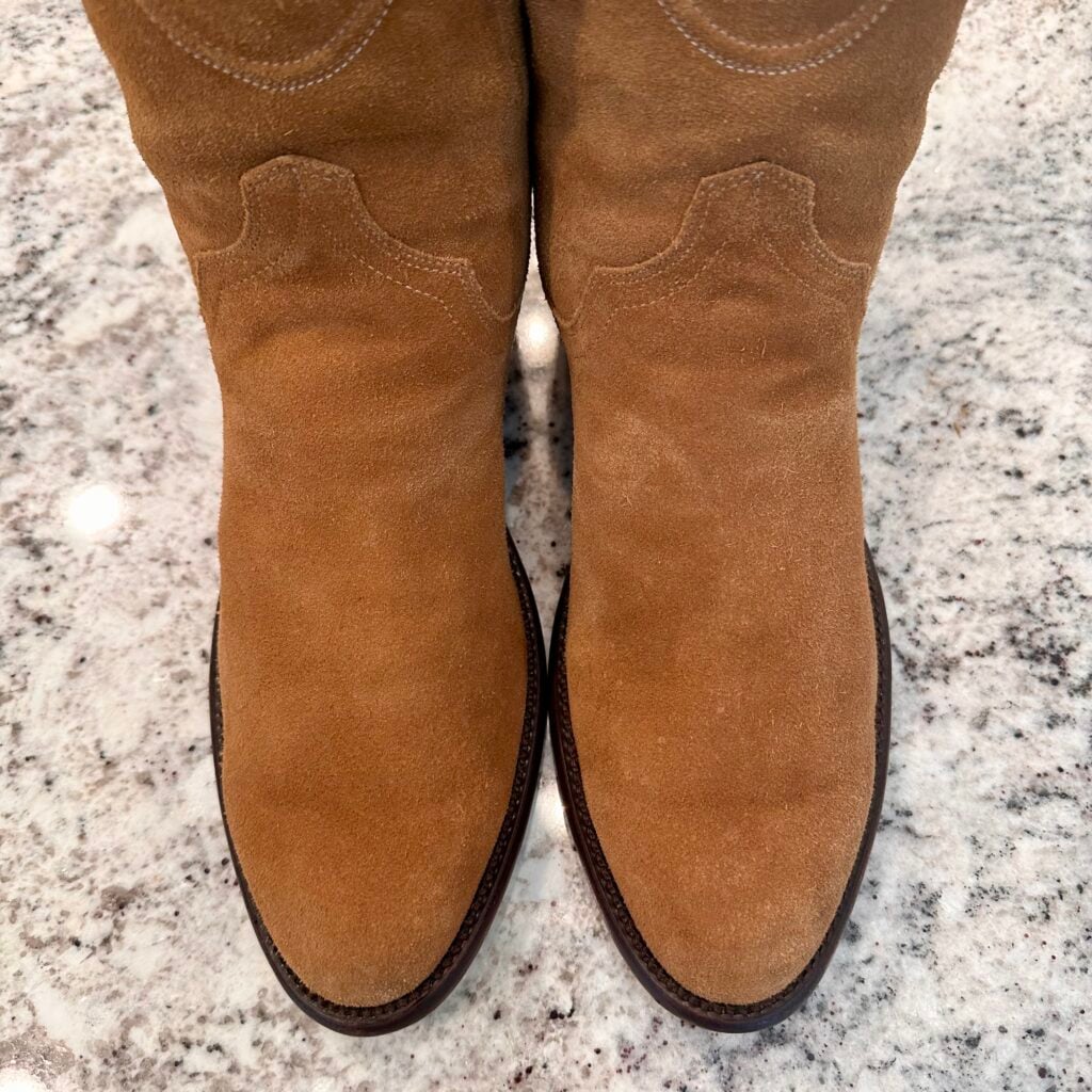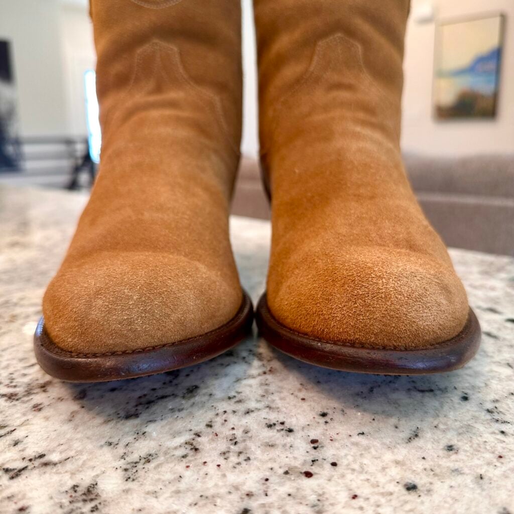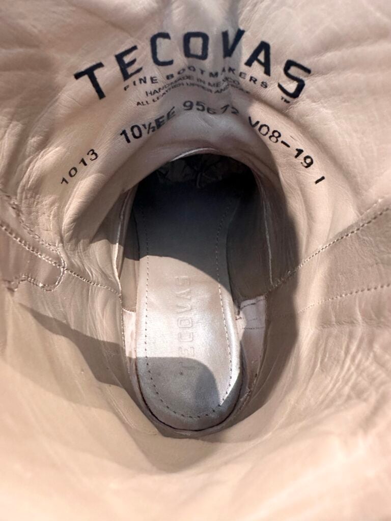 Type: These are men’s size 10.5 EE Tecovas ‘The Roy’ Zip Suede Boots. This is the Honey Suede version. The Tecovas Roy Boot was their original zip-up suede boot that they produced from 2019 to 2025 time frame. They have since discontinued the Roy and just combined it with the Dean Zip (which now comes in suede versions). These boots have a waterproof suede upper with a side-zip entry. There is an inner leather zipper guard for comfort. Round toe with leather outsoles and rubber heel caps. Tecovas style 1013. The suede is in good shape, but there is gentle scuffing near the toes and heels from use and some gentle creasing from use. Zippers in good working condition.