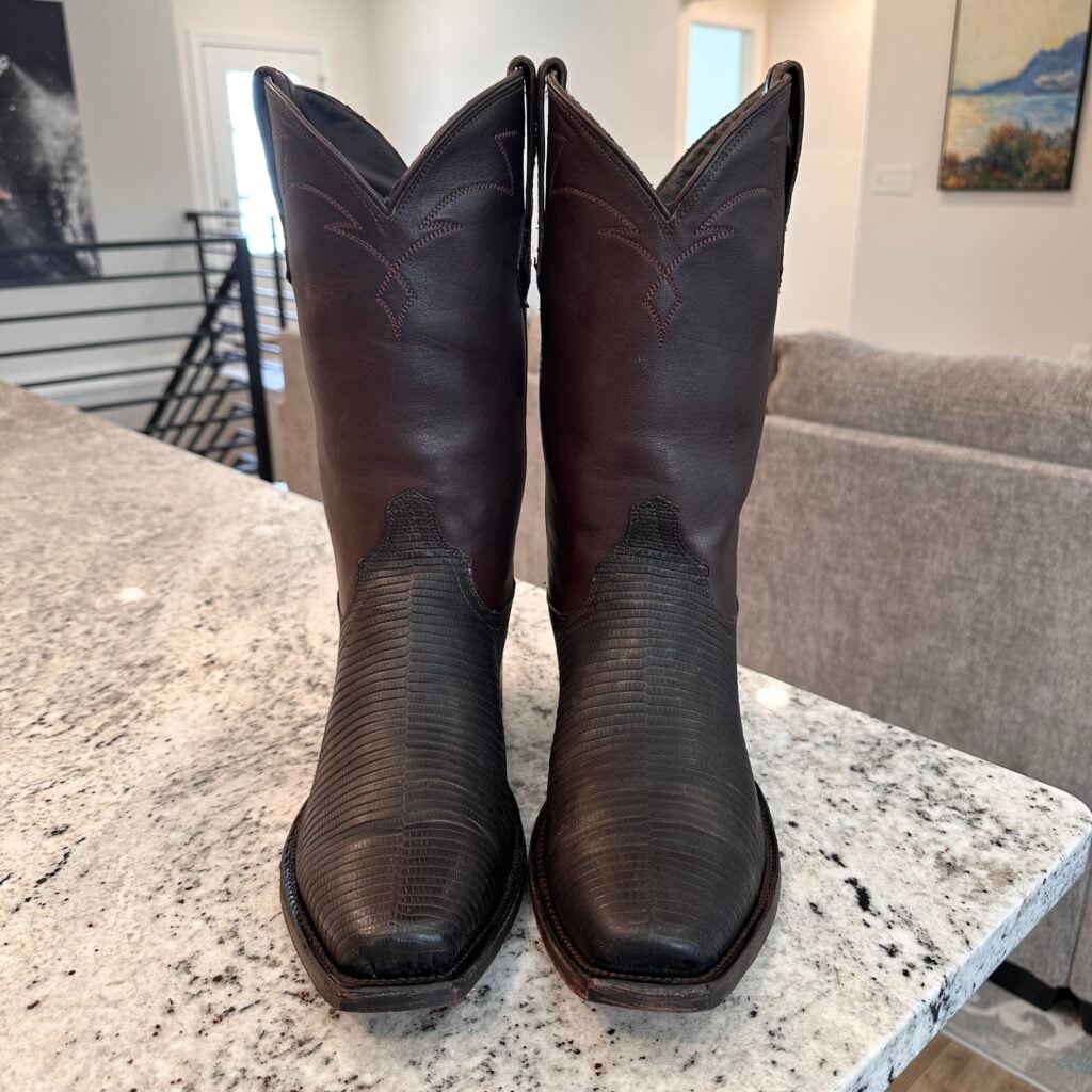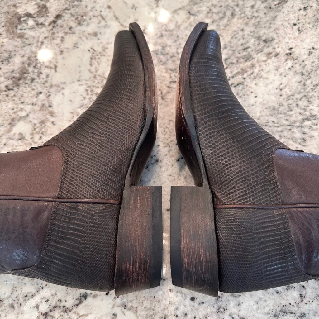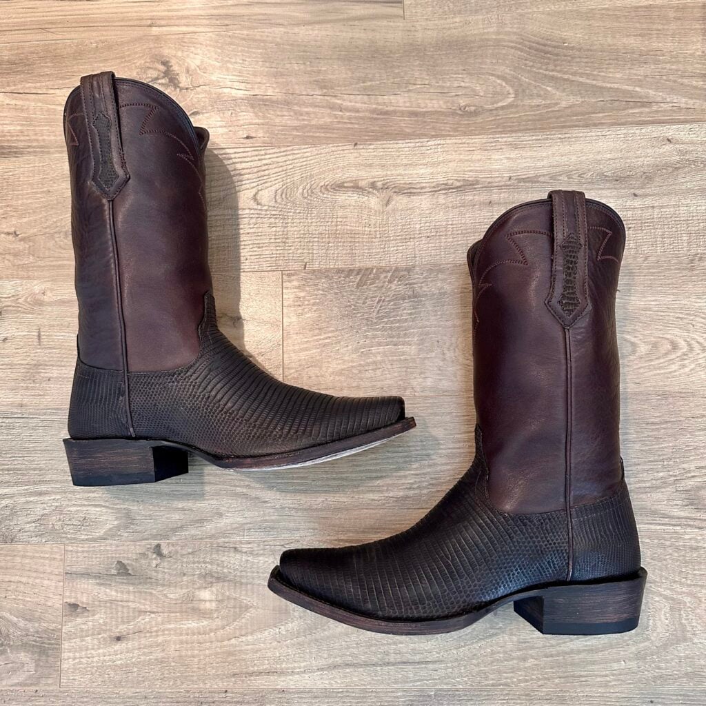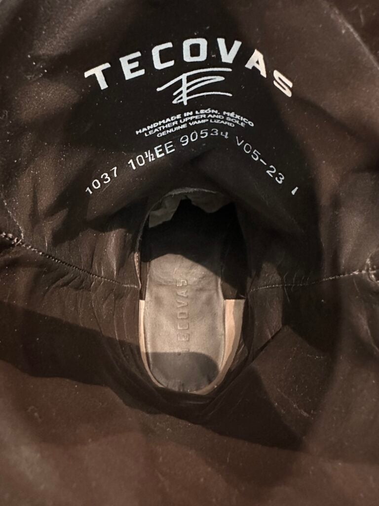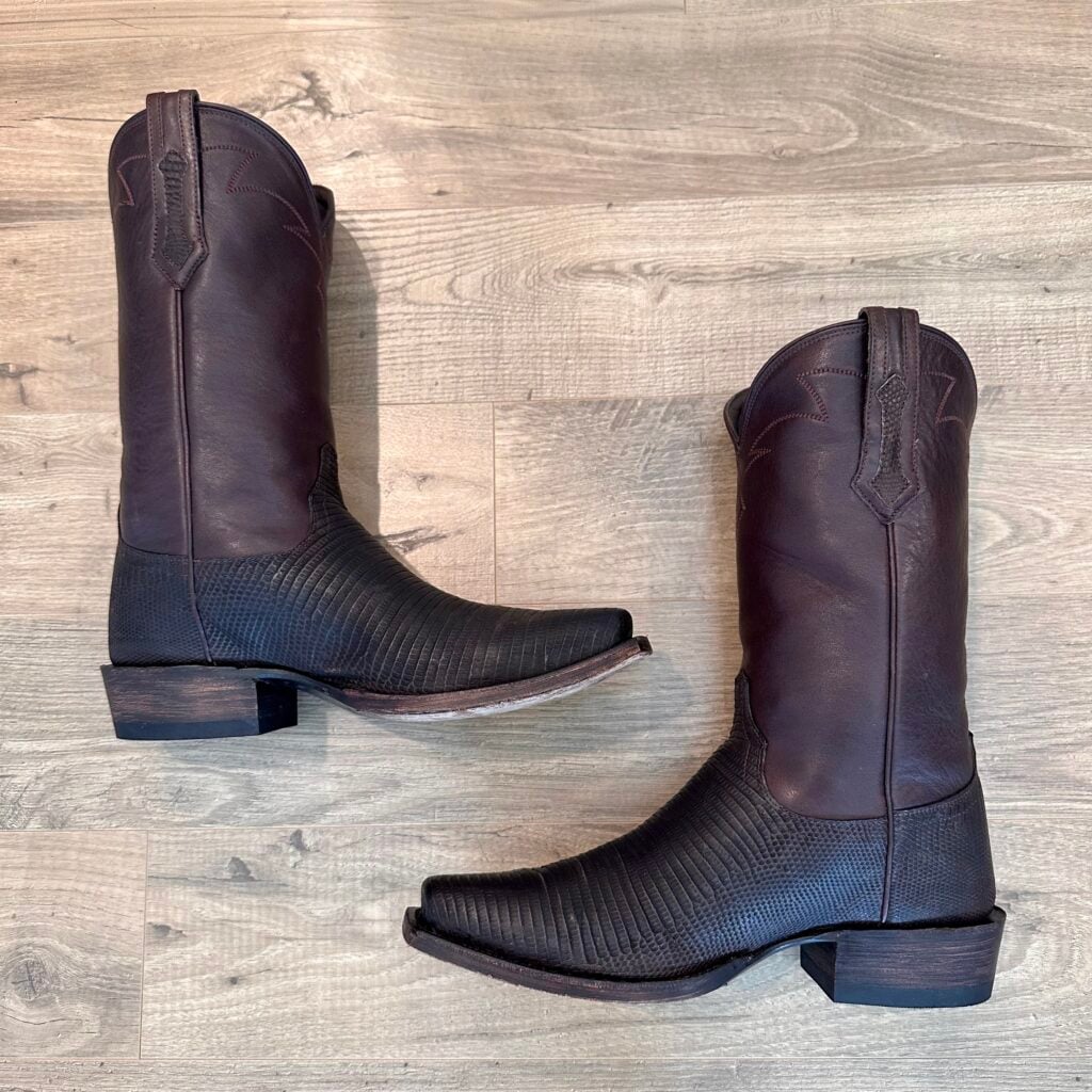 Type: These are men’s size 10.5 width EE Tecovas Thomas Rhett ‘The Lankford’ Boots in colorway Chocolate Relic. These boots were part of a 2023 limited edition celebrity collaboration between Tecovas and country music artist Thomas Rhett. In this collaboration, six types of boots were released, including this Lankford Boot. The Lankford features a lizard leather foot (Varanus salvator lizard) in combination with a cowhide shaft. There are also lizard leather accents on the shaft pull tabs. The boot features leather outsoles with rubber heel caps and a cutter toe design. Tecovas style 1037. The lizard leather is in good condition with no cracks or tears.