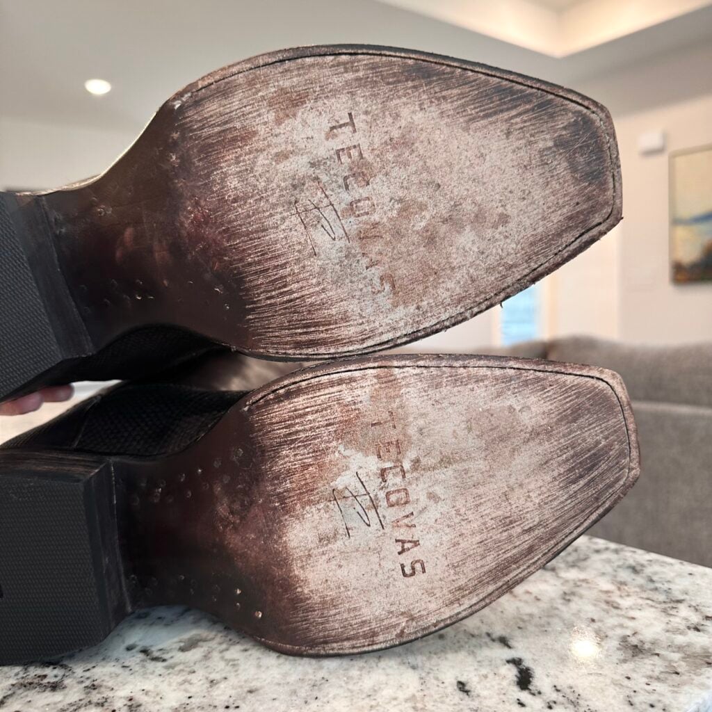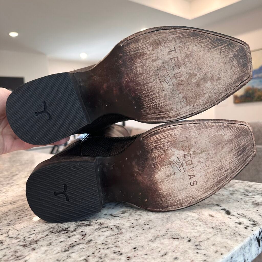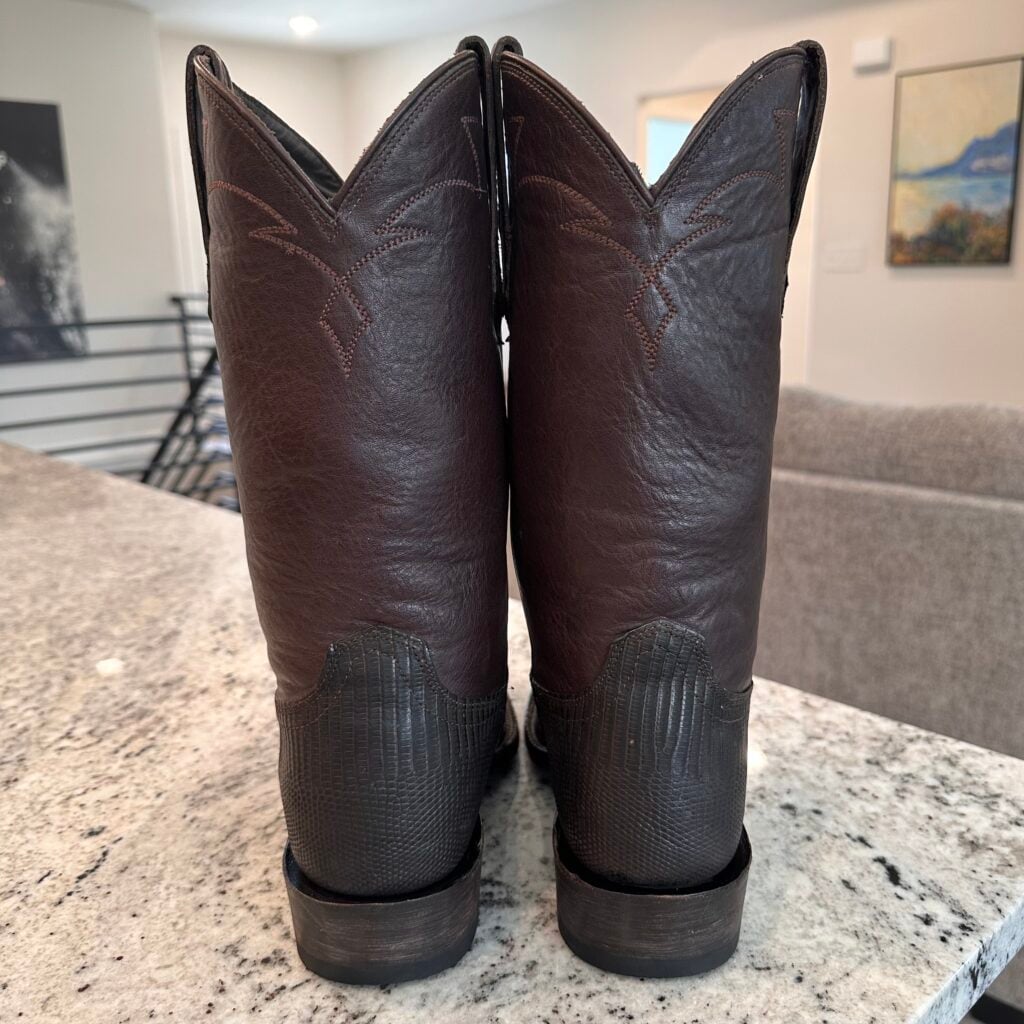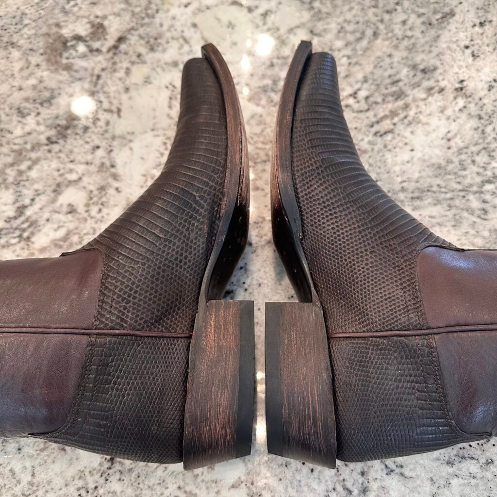 Type: These are men’s size 10.5 width EE Tecovas Thomas Rhett ‘The Lankford’ Boots in colorway Chocolate Relic. These boots were part of a 2023 limited edition celebrity collaboration between Tecovas and country music artist Thomas Rhett. In this collaboration, six types of boots were released, including this Lankford Boot. The Lankford features a lizard leather foot (Varanus salvator lizard) in combination with a cowhide shaft. There are also lizard leather accents on the shaft pull tabs. The boot features leather outsoles with rubber heel caps and a cutter toe design. Tecovas style 1037. The lizard leather is in good condition with no cracks or tears.