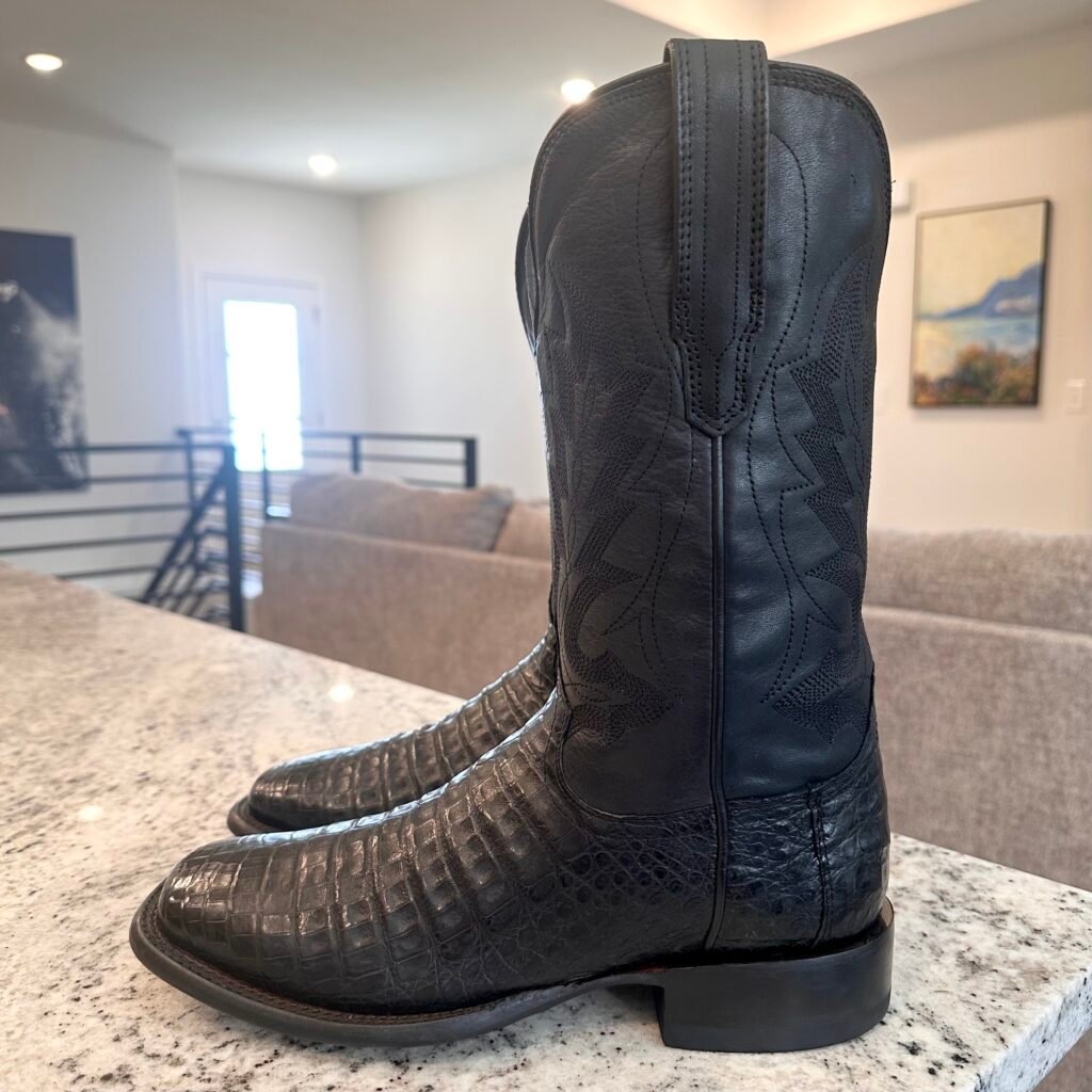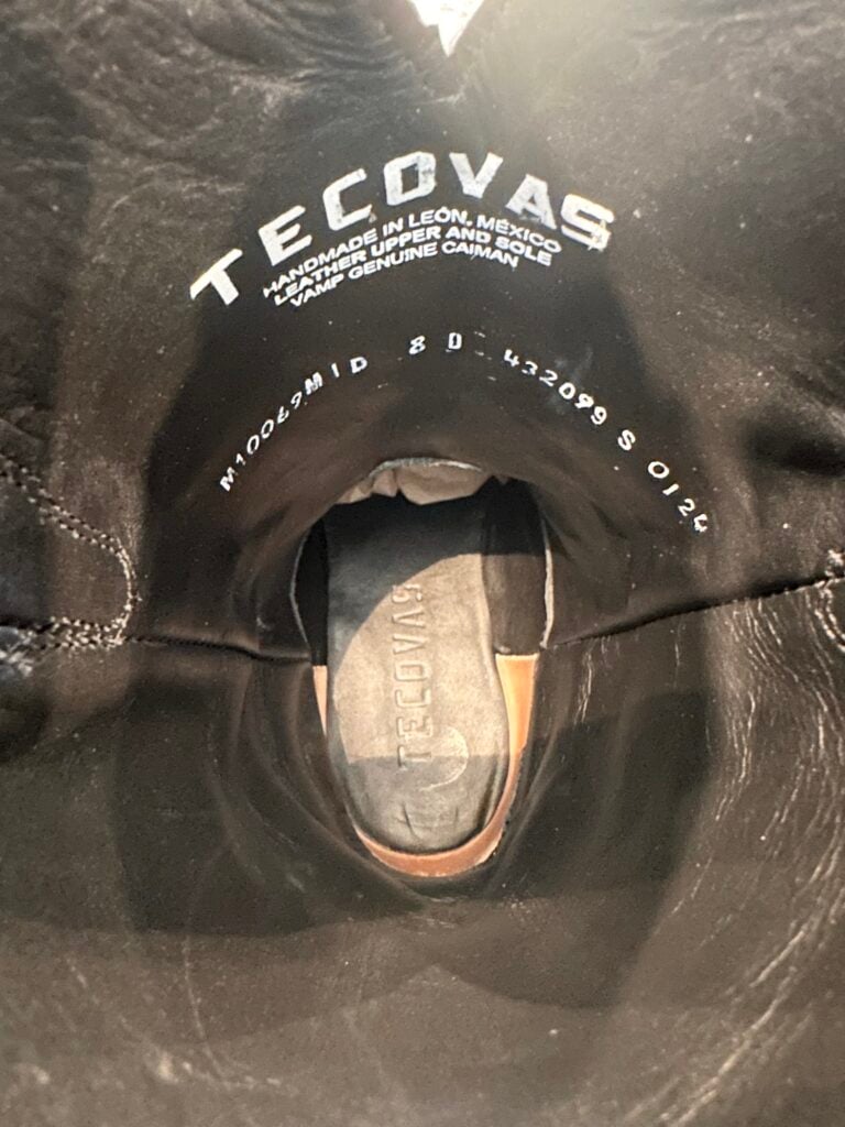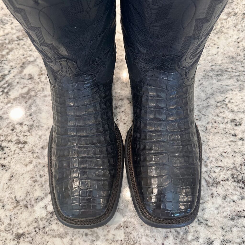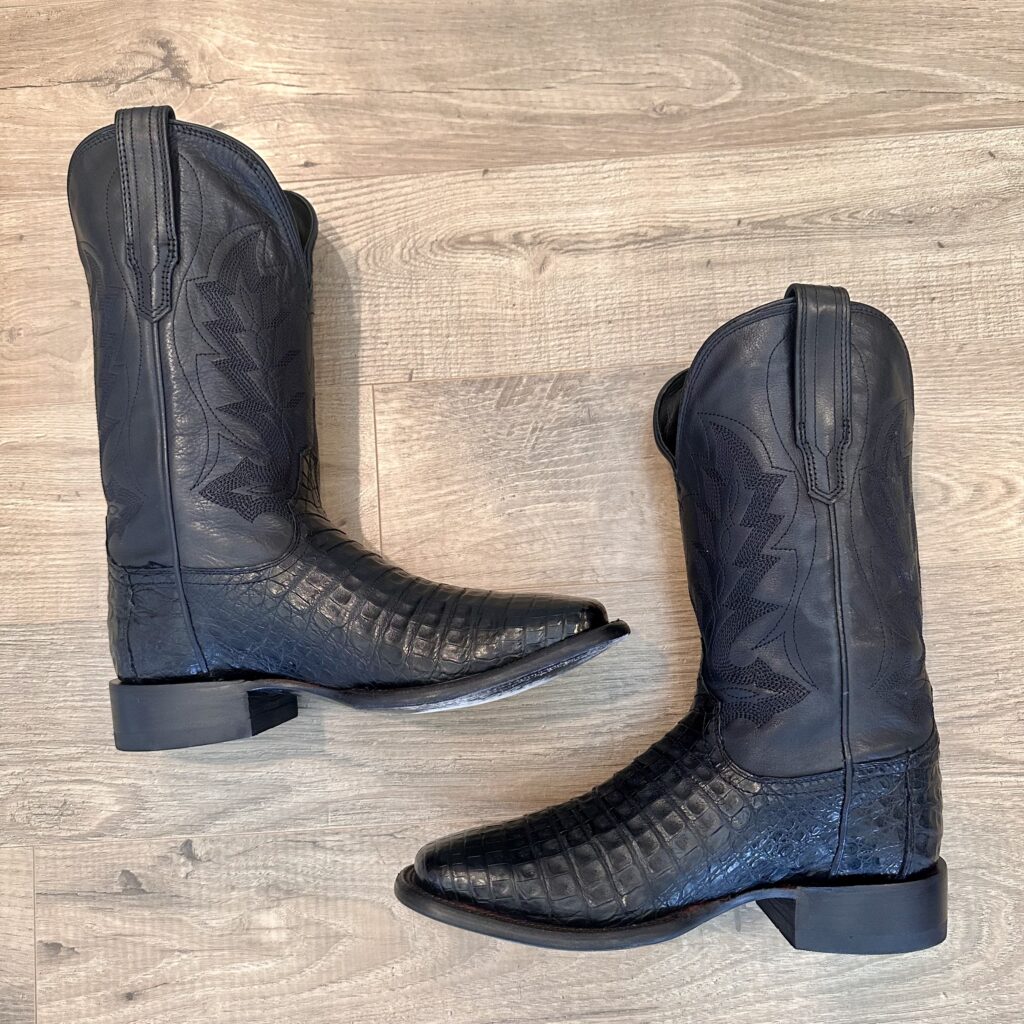 Type: These are men’s size 8 D Tecovas ‘The William’ Caiman Boots in colorway “Midnight” Black. These boots have a caiman belly vamp with a cowhide leather shaft. Double stitched welt with a broad square toe and leather outsoles. Tecovas style M10069MID. Caiman leather is in good shape.