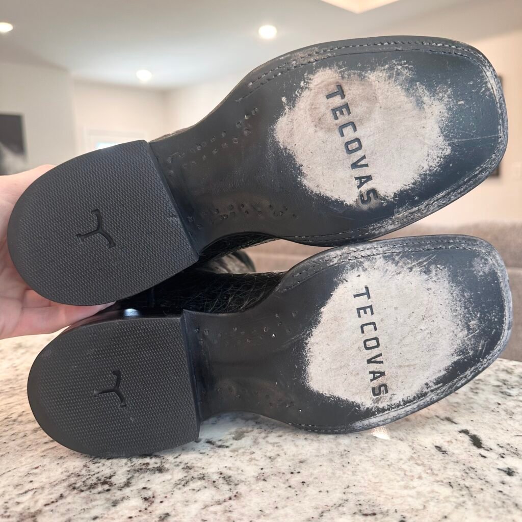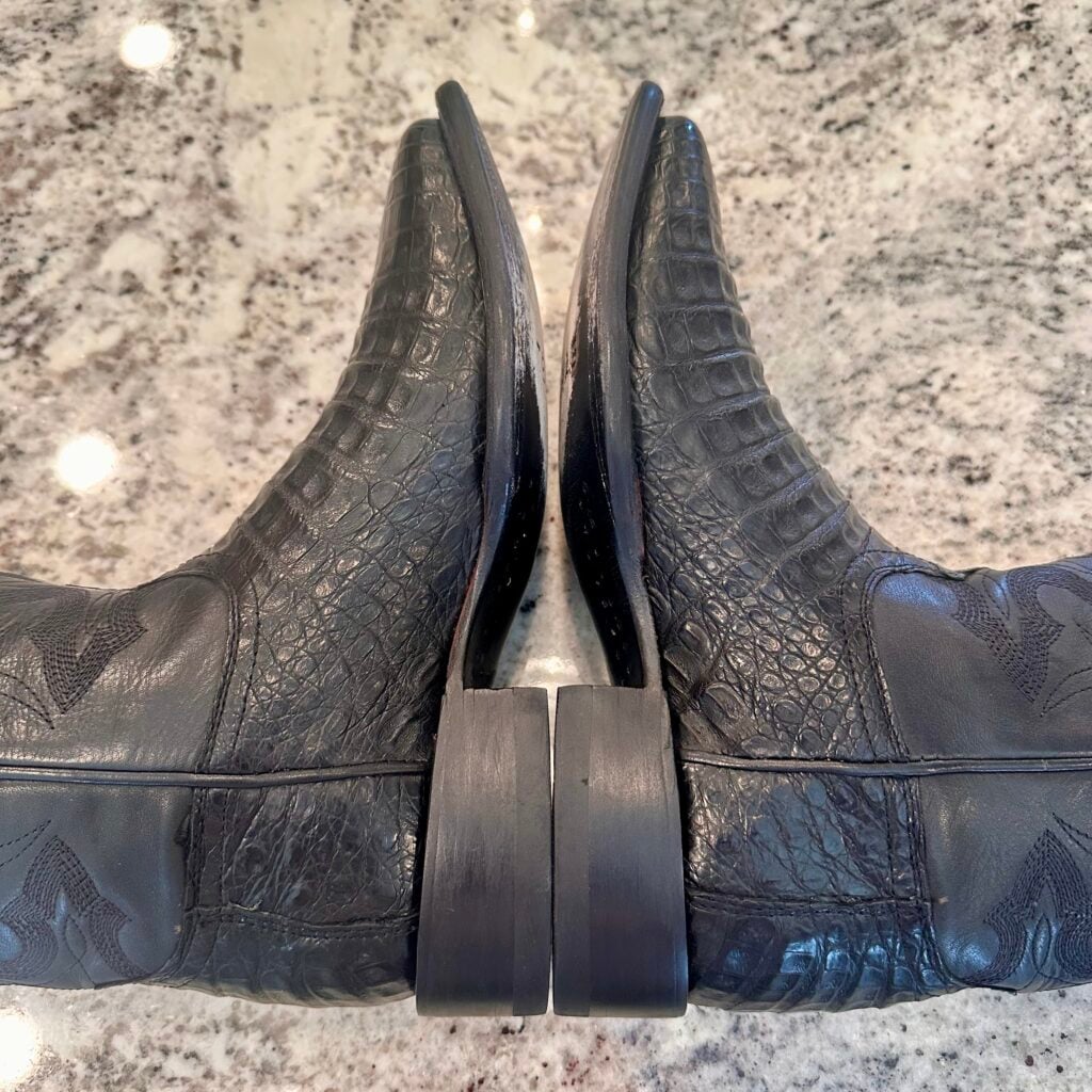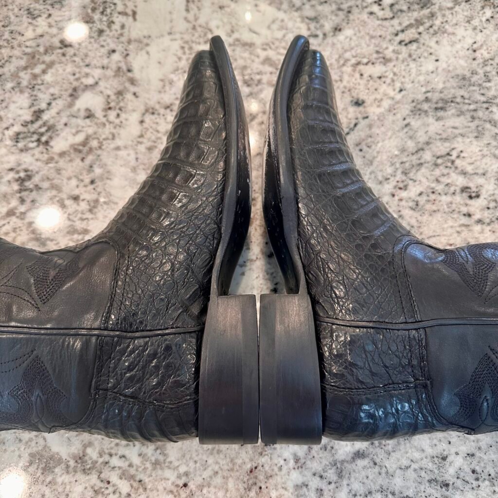 Type: These are men’s size 8 D Tecovas ‘The William’ Caiman Boots in colorway “Midnight” Black. These boots have a caiman belly vamp with a cowhide leather shaft. Double stitched welt with a broad square toe and leather outsoles. Tecovas style M10069MID. Caiman leather is in good shape.