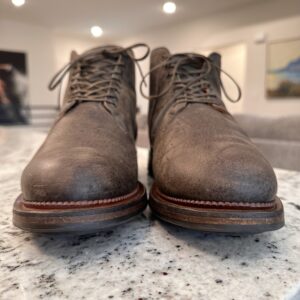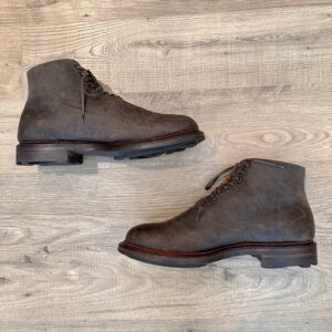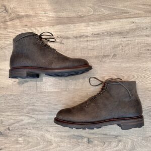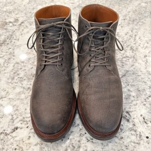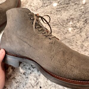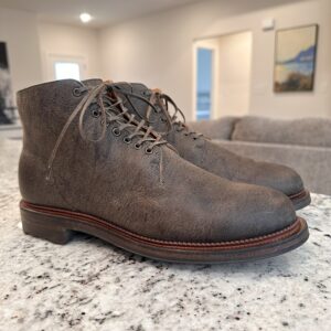 Type: This boot is a collaboration between Viberg and Division Road. It is the Viberg x Division Road Stone Waxed Kudu Wholecut Boot. These boots are made with a Dainite Ridgeway outsole. They are made with Kudu leather (African antelope), specifically it is the Stone Waxed Kudu Leather from CF Stead Tannery. These boots are built with the 2030 Last (natural E Width). Built with a Goodyear Storm Welt with Antiqued Leather Scallop around welt. Leather Lined, Leather Structured Toe, Flat Waxed Laces.
