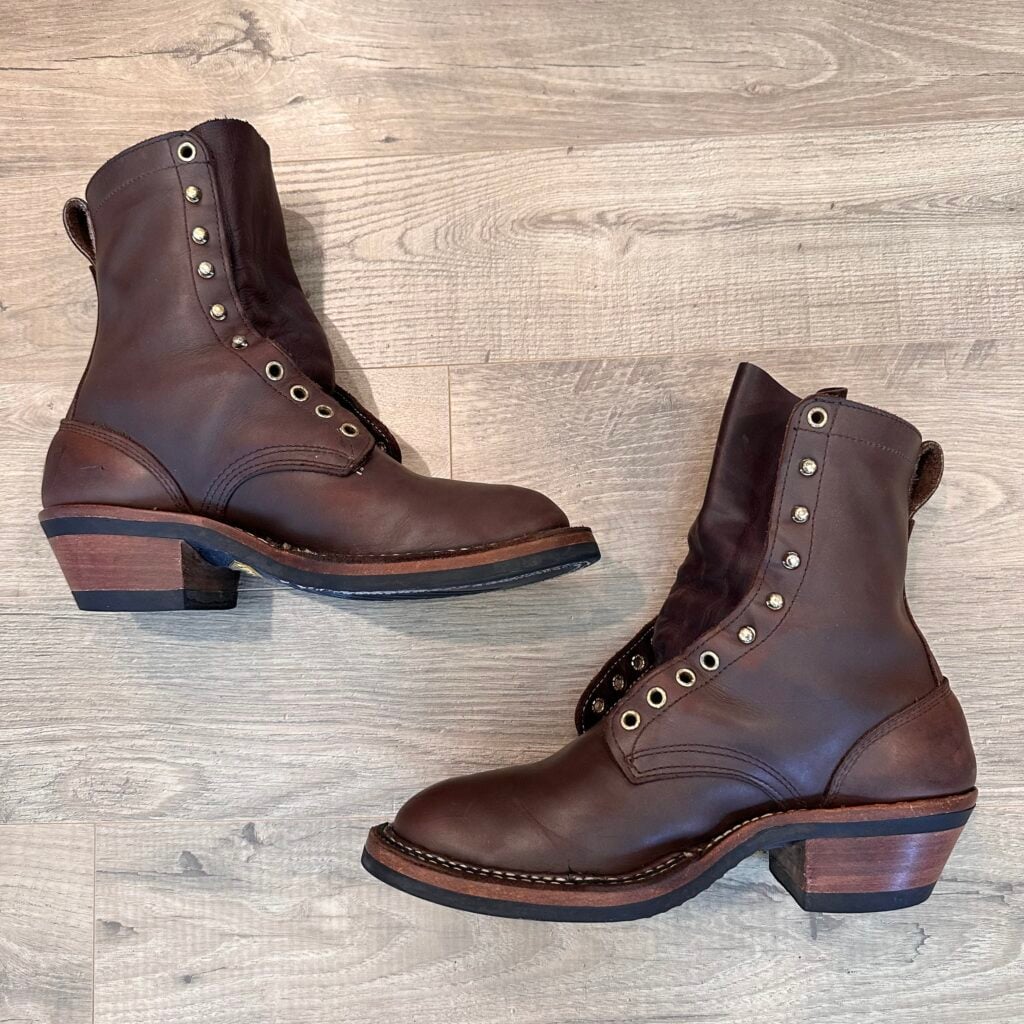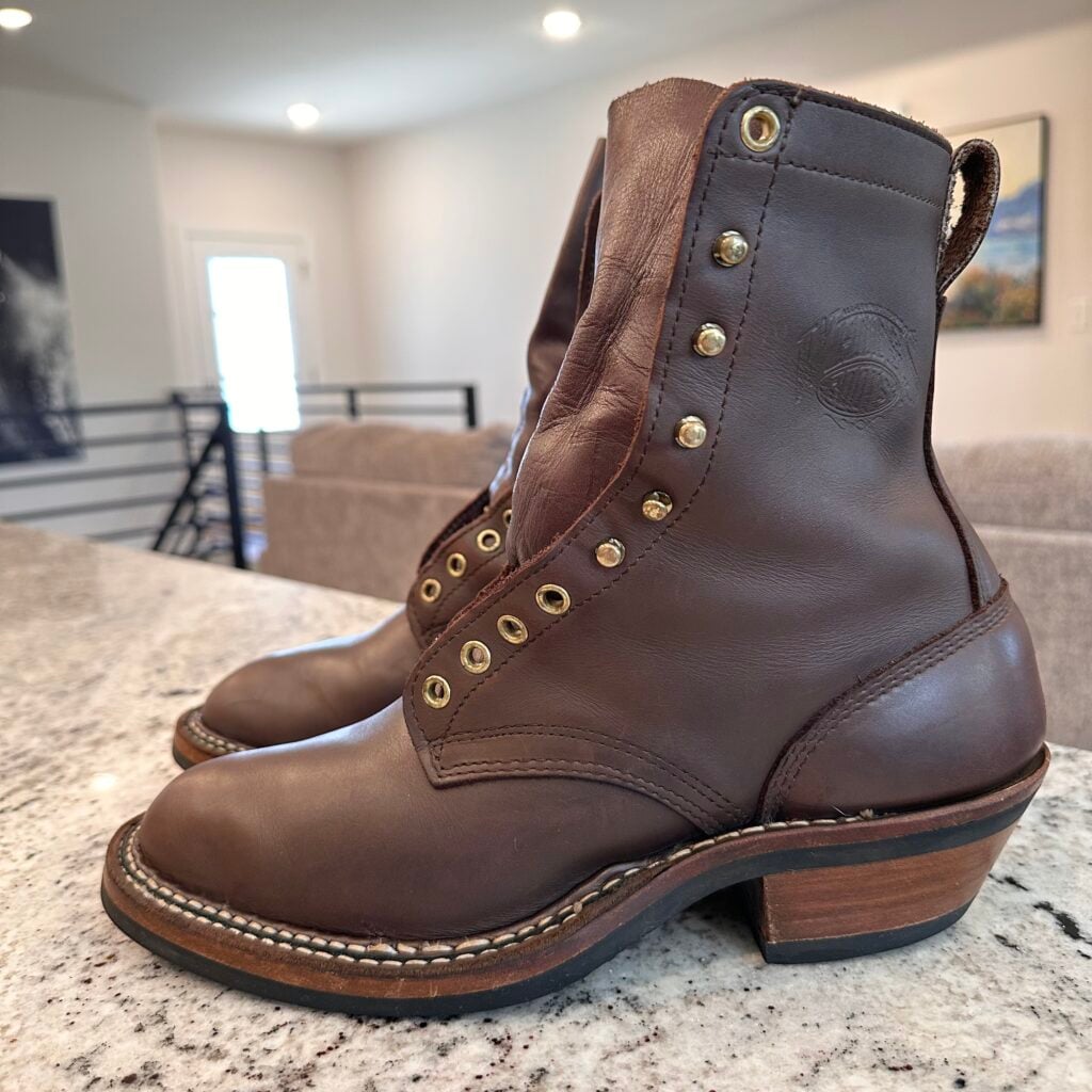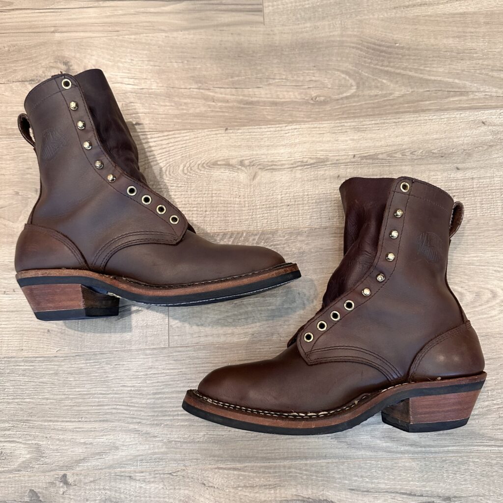 Type: These are men’s size 9.5 D White’s Original Packer Boots in colorway Brown. Style 690-C. These boots have the Vibram Composition Sole & Packer Heel.  Leather is in good shape. Hardware shows no corrosion. Overall, nice boots.
