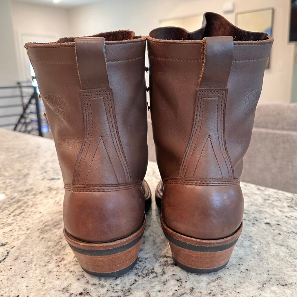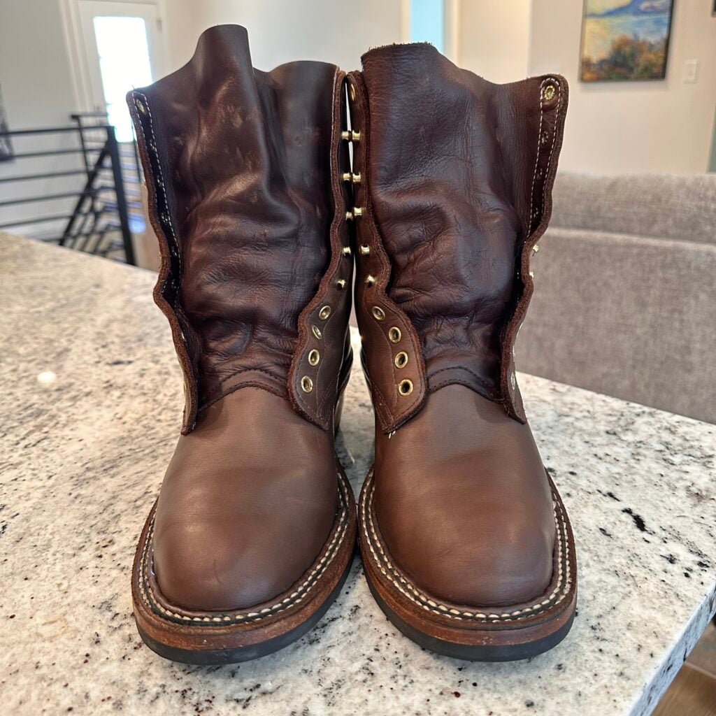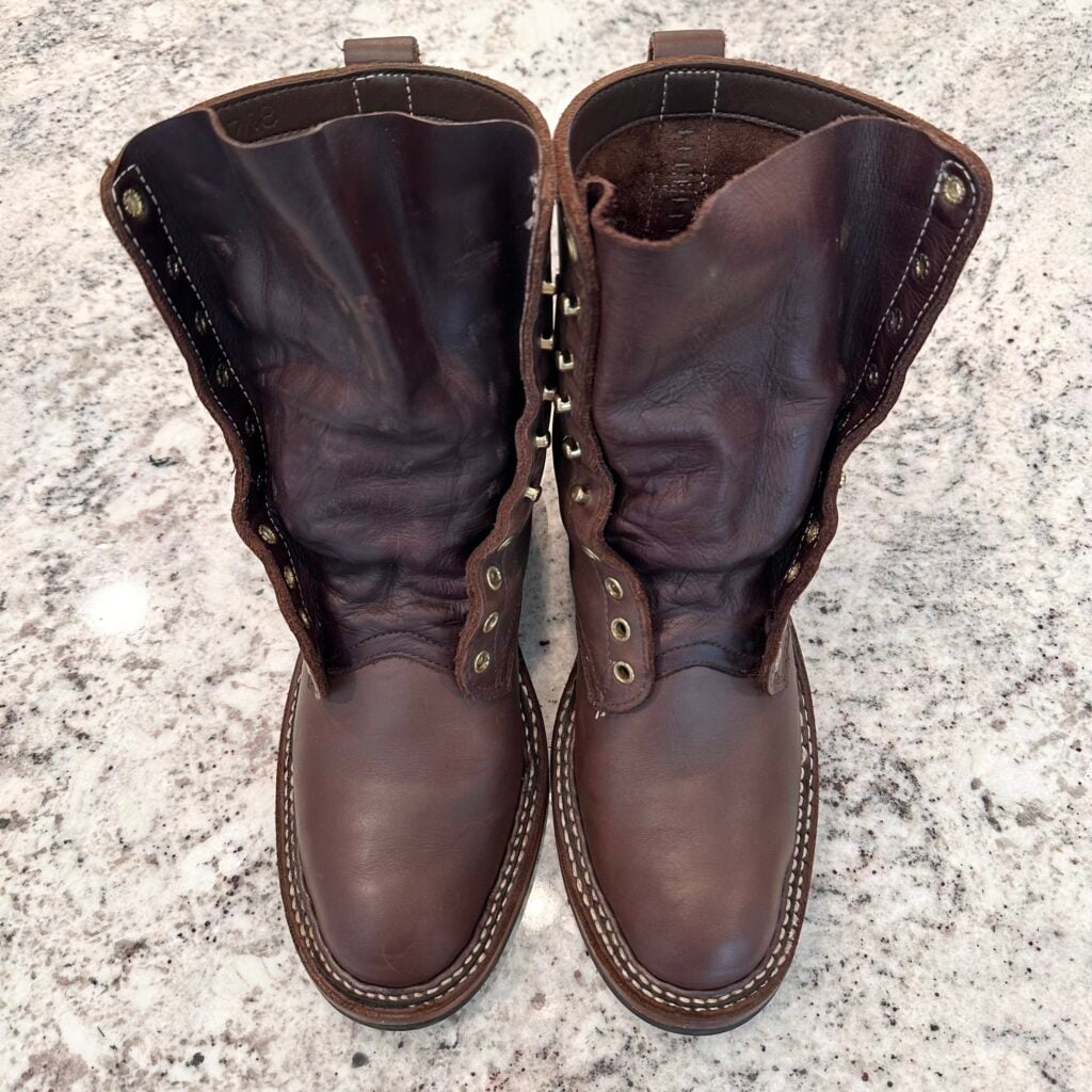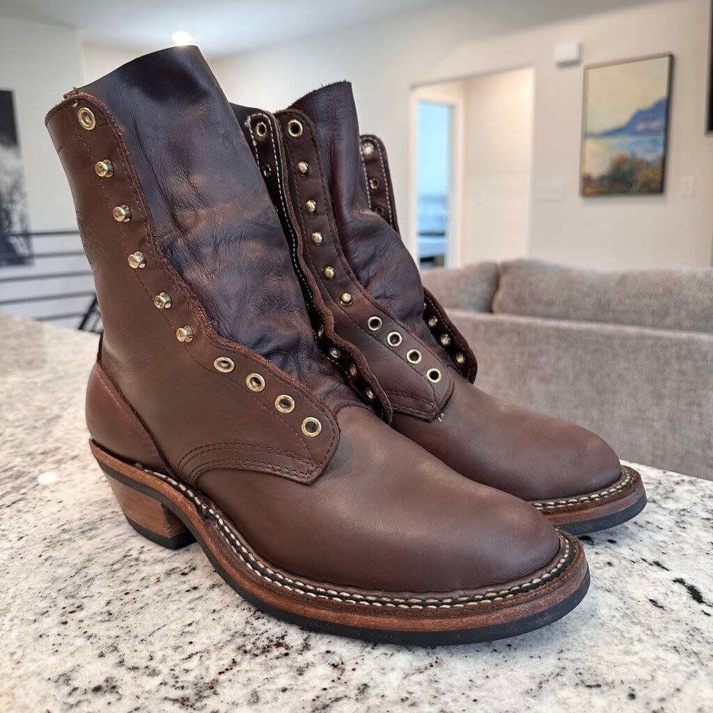 Type: These are men’s size 9.5 D White’s Original Packer Boots in colorway Brown. Style 690-C. These boots have the Vibram Composition Sole & Packer Heel.  Leather is in good shape. Hardware shows no corrosion. Overall, nice boots.